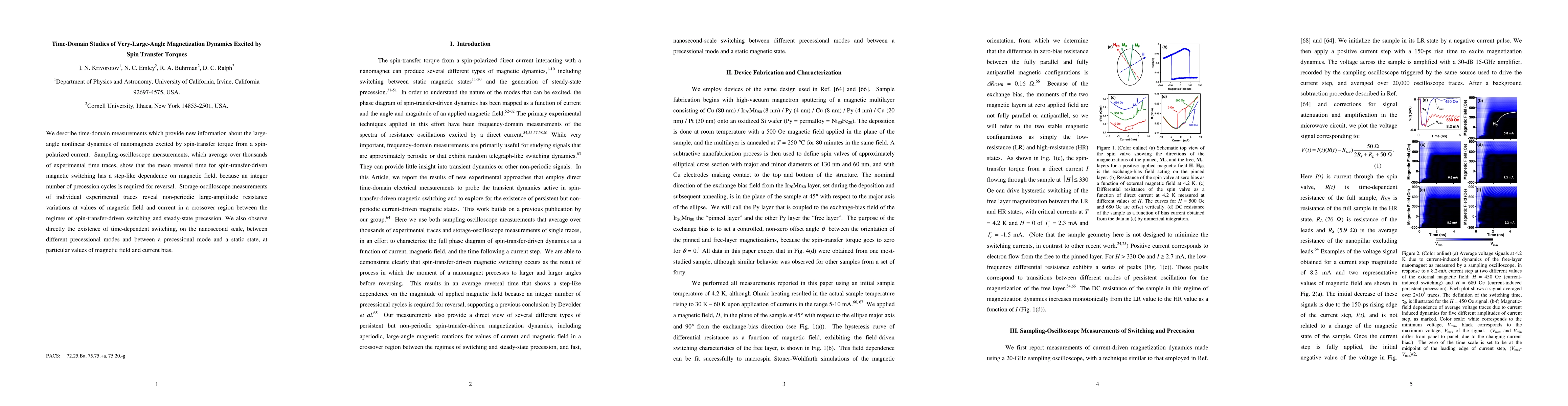 We describe time-domain measurements which provide new information about the large-angle nonlinear dynamics of nanomagnets excited by spin-transfer torque from a spin-polarized current. Sampling-oscilloscope measurements, which average over thousands of experimental time traces, show that the mean reversal time for spin-transfer-driven magnetic switching has a step-like dependence on magnetic field, because an integer number of precession cycles is required for reversal. Storage-oscilloscope measurements of individual experimental traces reveal non-periodic large-amplitude resistance variations at values of magnetic field and current in a crossover region between the regimes of spin-transfer-driven switching and steady-state precession. We also observe directly the existence of time-dependent switching, on the nanosecond scale, between different precessional modes and between a precessional mode and a static state, at particular values of magnetic field and current bias.
