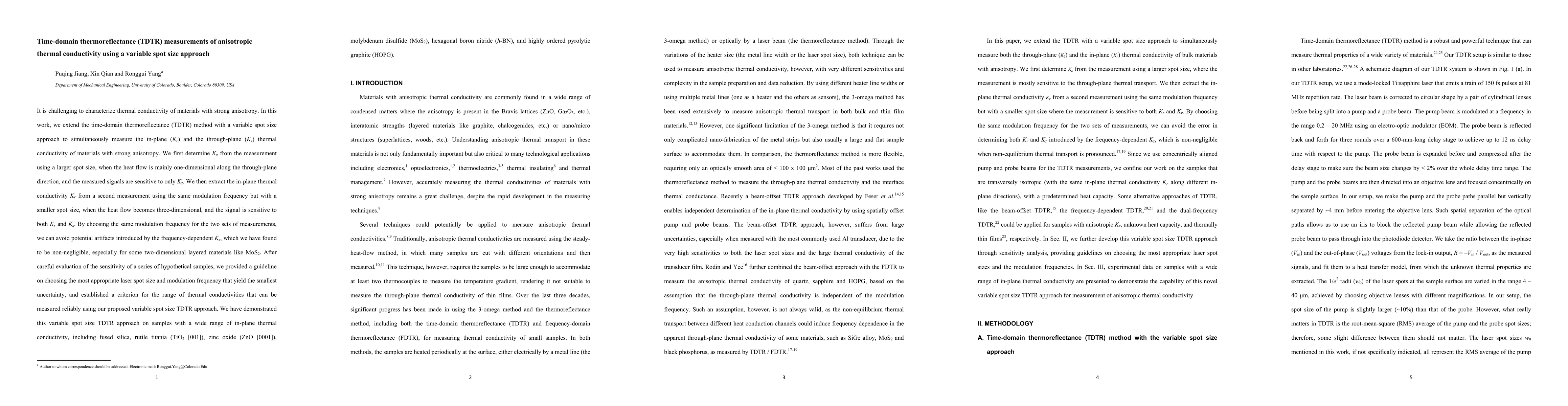 This paper proposes a variable spot size time-domain thermoreflectance (TDTR) method to measure anisotropic thermal conductivity in strongly anisotropic materials. The method distinguishes in-plane and through-plane conductivities by using different laser spot sizes, minimizing frequency-dependent artifacts and providing reliable measurements across various materials.