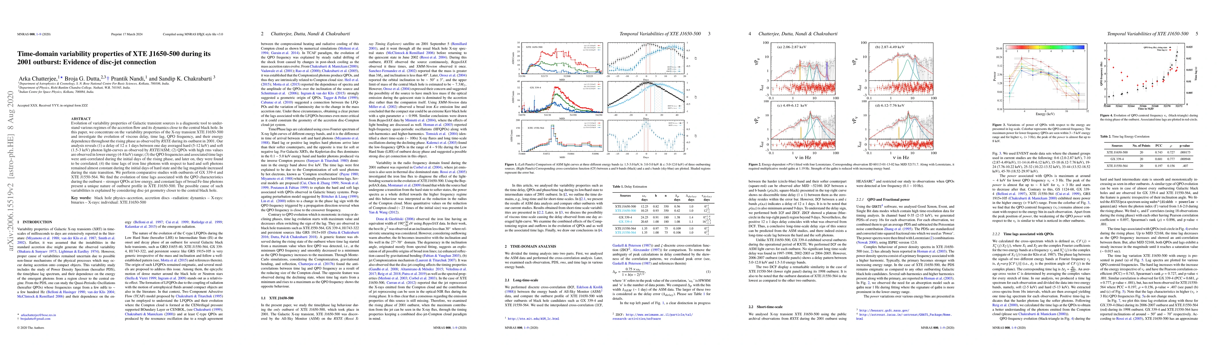 Evolution of variability properties of Galactic transient sources is a diagnostic tool to understand various regimes of the accretion flow and its dynamics close to the central black hole. In this paper, we concentrate on the variability properties of the X-ray transient XTE J1650-500 and investigate the evolution of viscous delay, time lag, QPO frequency, and their energy dependence throughout the rising phase as observed by RXTE during its outburst in 2001. Our analysis reveals (1) a delay of 12 \pm 1 days between one day averaged hard (5-12 keV) and soft (1.5-3 keV) photon light-curves as observed by RXTE/ASM; (2) QPOs with high rms values are observed in lower energy (4-8 keV) range; (3) the QPO frequencies and associated time lags were anti-correlated during the initial days of the rising phase, and later on, they were found to be correlated; (4) the time lags of iron line photons with respect to hard and soft photons remained almost constant during the initial days of hard state and the lag magnitude increased during the state transition. We perform comparative studies with outbursts of GX 339-4 and XTE J1550-564. We find the evolution of time lags associated with the QPO characteristics during the outburst - stronger QPOs at low energy, and constant lags of broad Fe-line photons present a unique nature of outburst profile in XTE J1650-500. The possible cause of such variabilities is explained by considering disk-jet geometry closer to the central black hole.