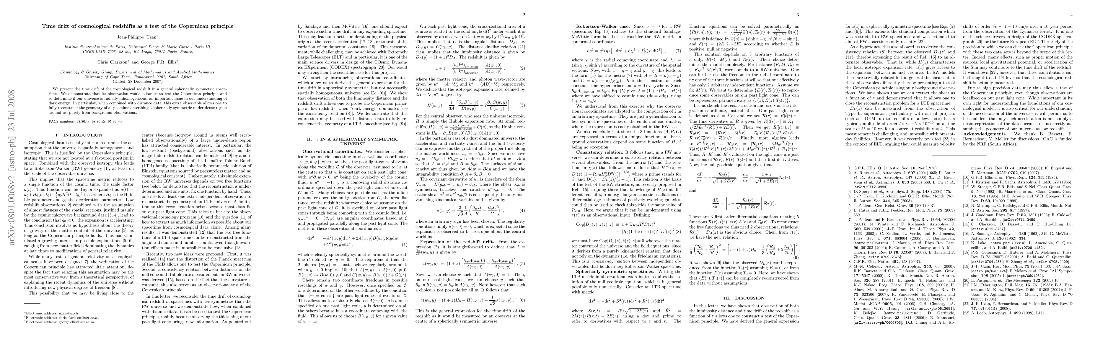 This paper investigates the time drift of cosmological redshifts in a general spherically symmetric spacetime to test the Copernican principle, aiming to determine if the universe is radially inhomogeneous. The observation of this time drift, combined with distance data, could reconstruct the geometry of a spherically symmetric under-dense region, providing insights into dark energy.