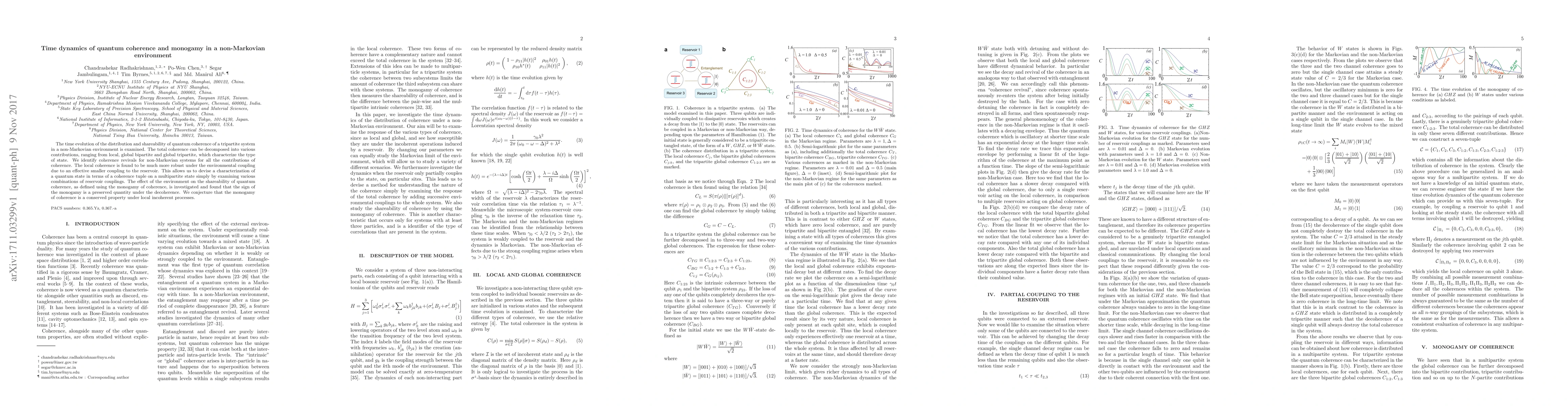 The study investigates the time evolution of quantum coherence in a tripartite system within a non-Markovian environment, identifying coherence revivals and showing local coherence's greater robustness. It also explores the monogamy of coherence, finding it preserved despite environmental influences.