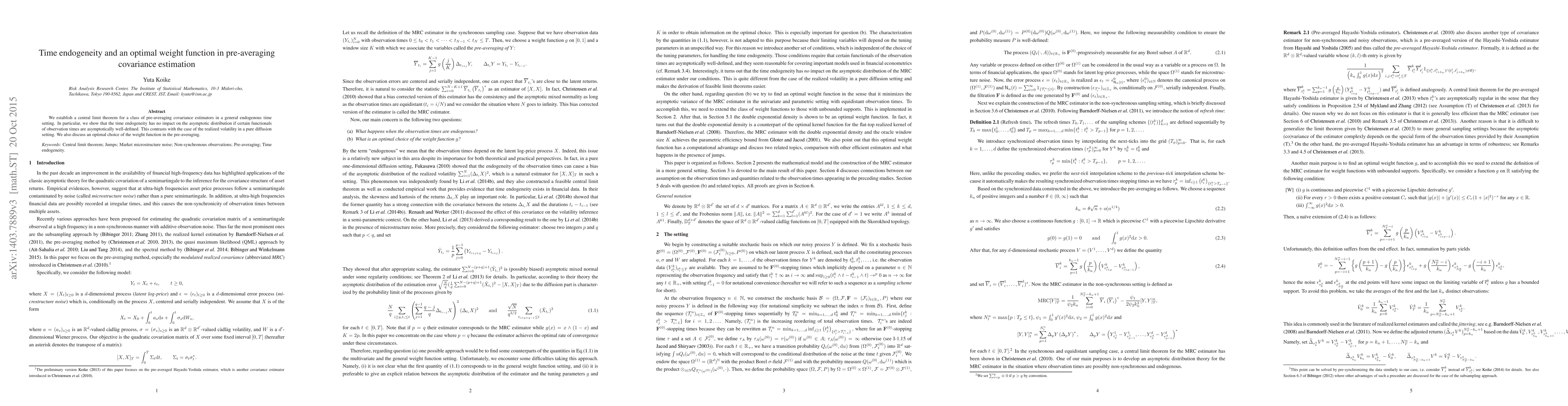 We establish a central limit theorem for a class of pre-averaging covariance estimators in a general endogenous time setting. In particular, we show that the time endogeneity has no impact on the asymptotic distribution if certain functionals of observation times are asymptotically well-defined. This contrasts with the case of the realized volatility in a pure diffusion setting. We also discuss an optimal choice of the weight function in the pre-averaging.