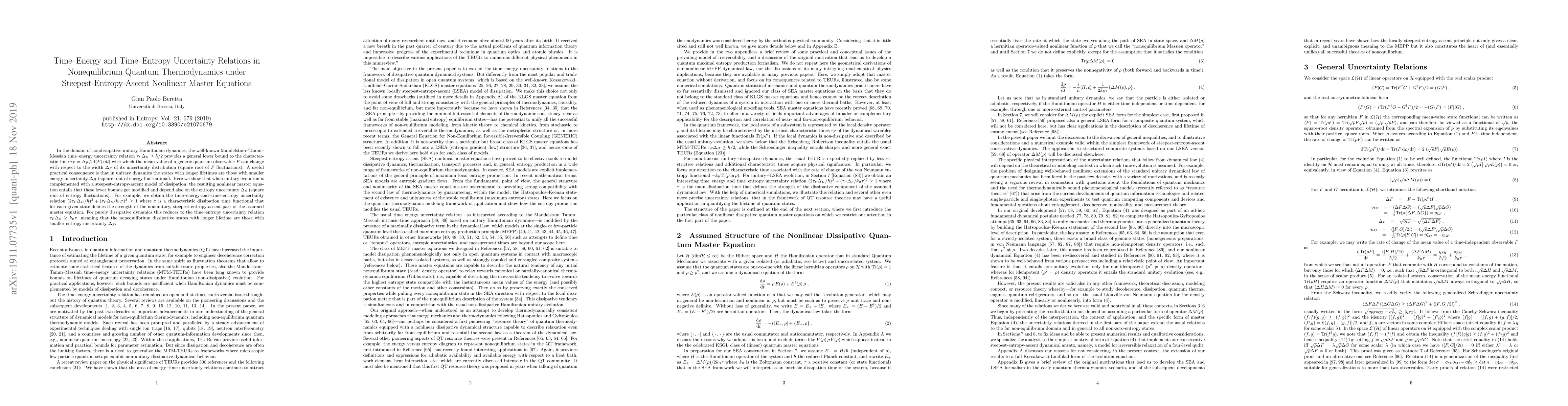 This paper explores how time-energy uncertainty relations adapt in nonequilibrium quantum thermodynamics under steepest-entropy-ascent nonlinear master equations, showing that both energy and entropy uncertainties influence the rate of change of quantum observables, with the derived time-energy-time-entropy uncertainty relation providing a modified lower bound.