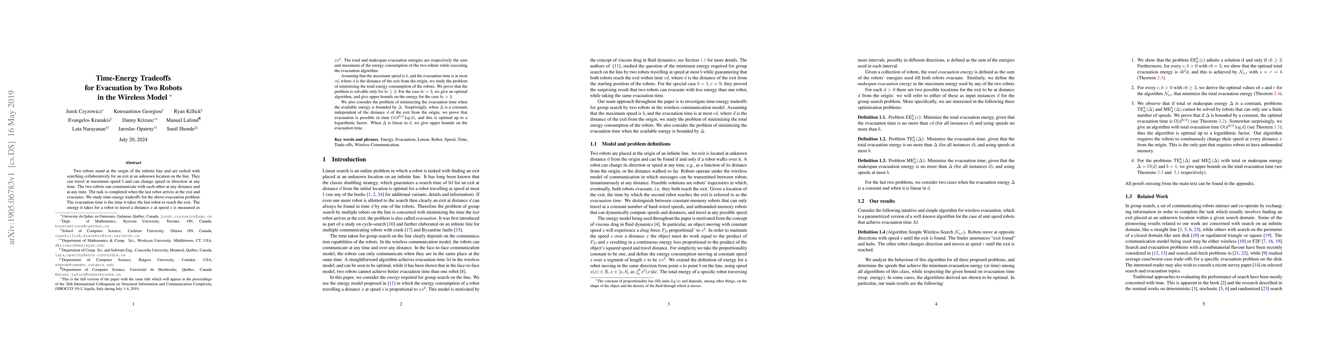 Two robots stand at the origin of the infinite line and are tasked with searching collaboratively for an exit at an unknown location on the line. They can travel at maximum speed $b$ and can change speed or direction at any time. The two robots can communicate with each other at any distance and at any time. The task is completed when the last robot arrives at the exit and evacuates. We study time-energy tradeoffs for the above evacuation problem. The evacuation time is the time it takes the last robot to reach the exit. The energy it takes for a robot to travel a distance $x$ at speed $s$ is measured as $xs^2$. The total and makespan evacuation energies are respectively the sum and maximum of the energy consumption of the two robots while executing the evacuation algorithm. Assuming that the maximum speed is $b$, and the evacuation time is at most $cd$, where $d$ is the distance of the exit from the origin, we study the problem of minimizing the total energy consumption of the robots. We prove that the problem is solvable only for $bc \geq 3$. For the case $bc=3$, we give an optimal algorithm, and give upper bounds on the energy for the case $bc>3$. We also consider the problem of minimizing the evacuation time when the available energy is bounded by $\Delta$. Surprisingly, when $\Delta$ is a constant, independent of the distance $d$ of the exit from the origin, we prove that evacuation is possible in time $O(d^{3/2}\log d)$, and this is optimal up to a logarithmic factor. When $\Delta$ is linear in $d$, we give upper bounds on the evacuation time.