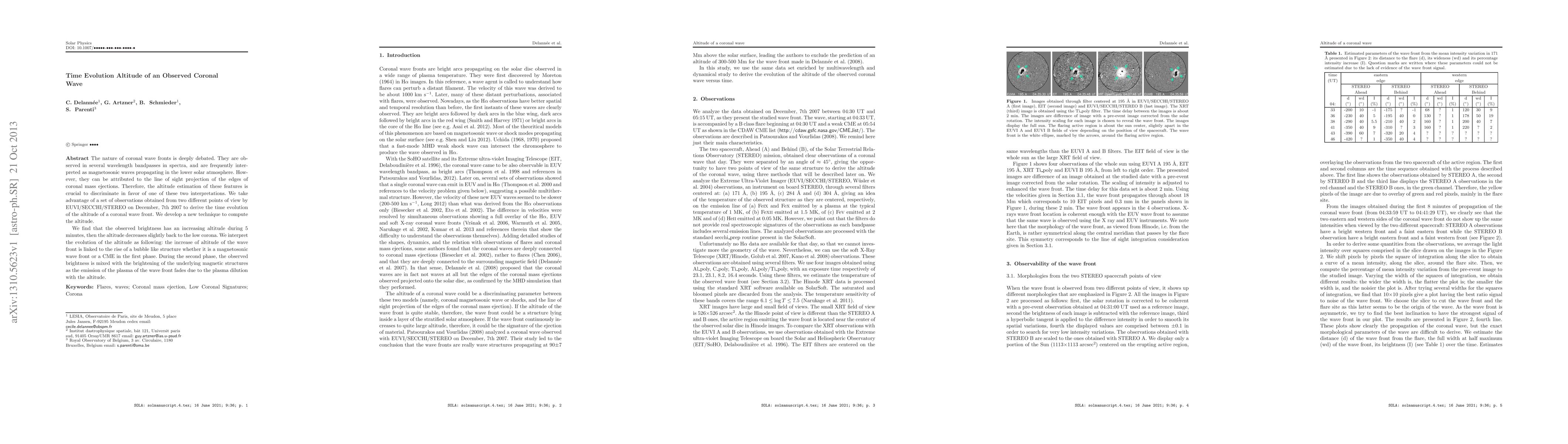 The nature of coronal wave fronts is deeply debated. They are observed in several wavelength bandpasses in spectra, and are frequently interpreted as magnetosonic waves propagating in the lower solar atmosphere. However, they can be attributed to the line of sight projection of the edges of coronal mass ejections. Therefore, the altitude estimation of these features is crucial to discriminate in favor of one of these two interpretations. We take advantage of a set of observations obtained from two different points of view by EUVI/SECCHI/STEREO on December, 7th 2007 to derive the time evolution of the altitude of a coronal wave front. We develop a new technique to compute the altitude. We find that the observed brightness has an increasing altitude during 5 minutes, then the altitude decreases slightly back to the low corona. We interpret the evolution of the altitude as following: the increase of altitude of the wave front is linked to the rise of a bubble like structure whether it is a magnetosonic wave front or a CME in the first phase. During the second phase, the observed brightness is mixed with the brightening of the underlying magnetic structures as the emission of the plasma of the wave front fades due to the plasma dilution with the altitude.
