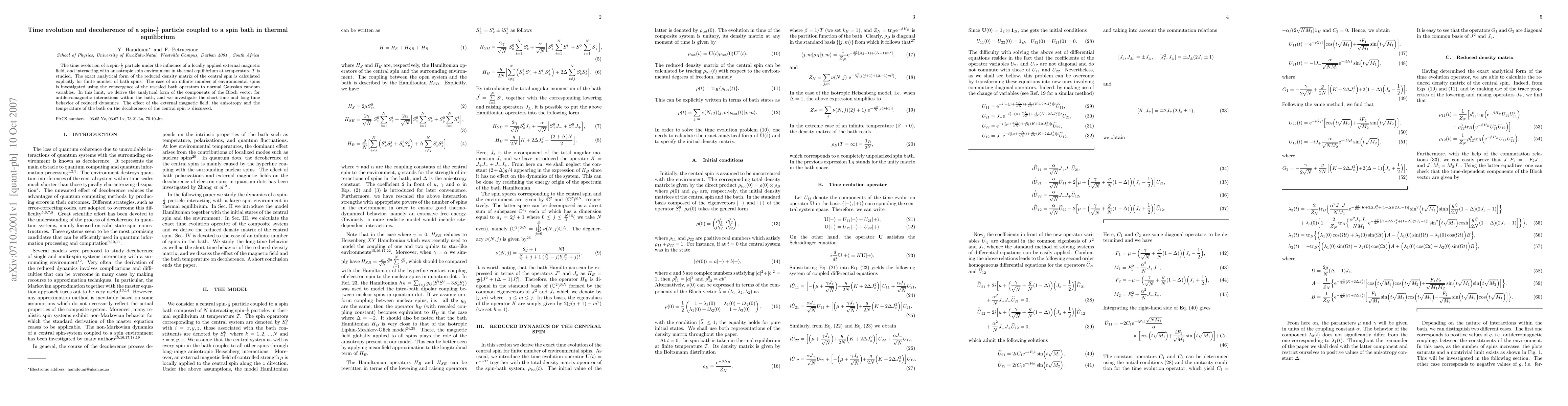 This paper studies the time evolution and decoherence of a spin-1/2 particle interacting with an anisotropic spin bath in thermal equilibrium. It provides an analytical form for the reduced density matrix and investigates the dynamics of the Bloch vector components under antiferromagnetic interactions, analyzing the influence of external fields, anisotropy, and temperature on decoherence.