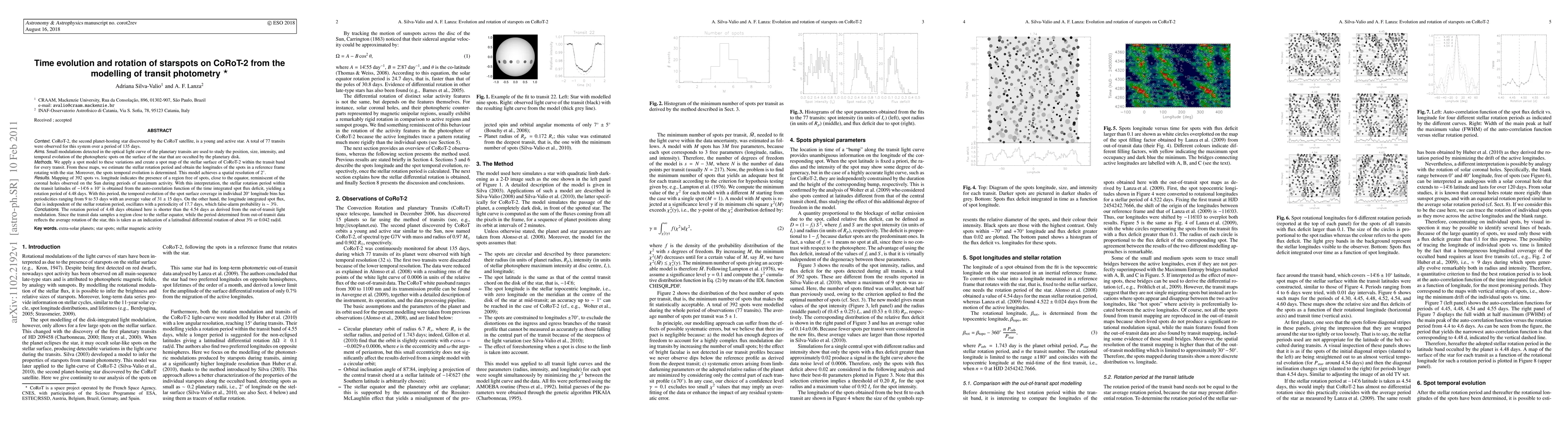 This paper analyzes the time evolution and rotation of starspots on CoRoT-2 using transit photometry data, revealing a rotation period of 4.48 days within transit latitudes and indicating latitudinal differential rotation. The study maps 392 spots and finds a region free of spots near the equator, similar to solar coronal holes.