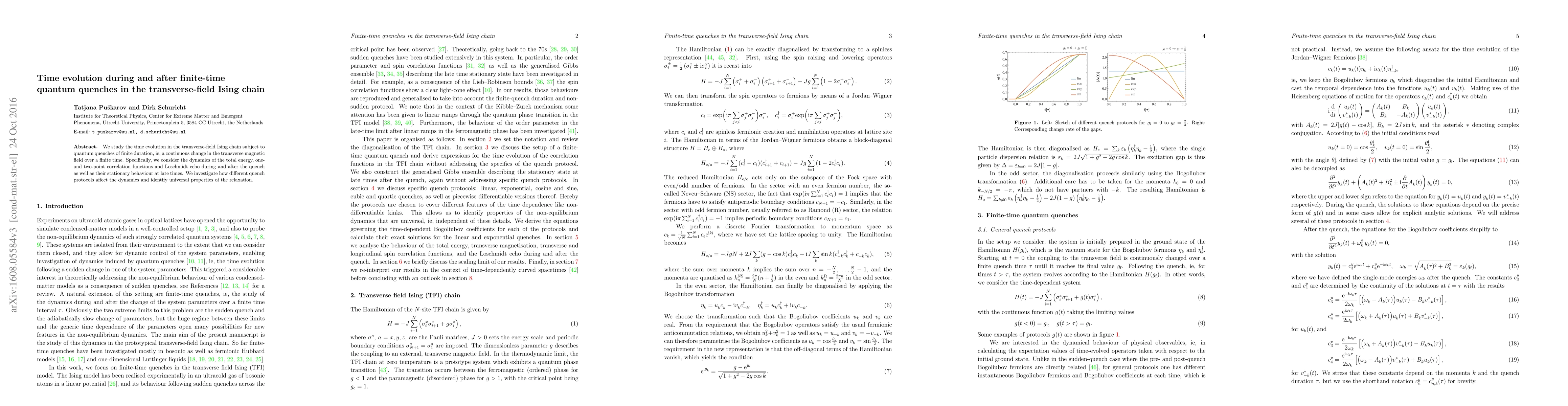 This paper investigates the time evolution dynamics in the transverse-field Ising chain following finite-time quantum quenches, focusing on total energy, correlation functions, and Loschmidt echo, and identifies universal relaxation properties influenced by various quench protocols.