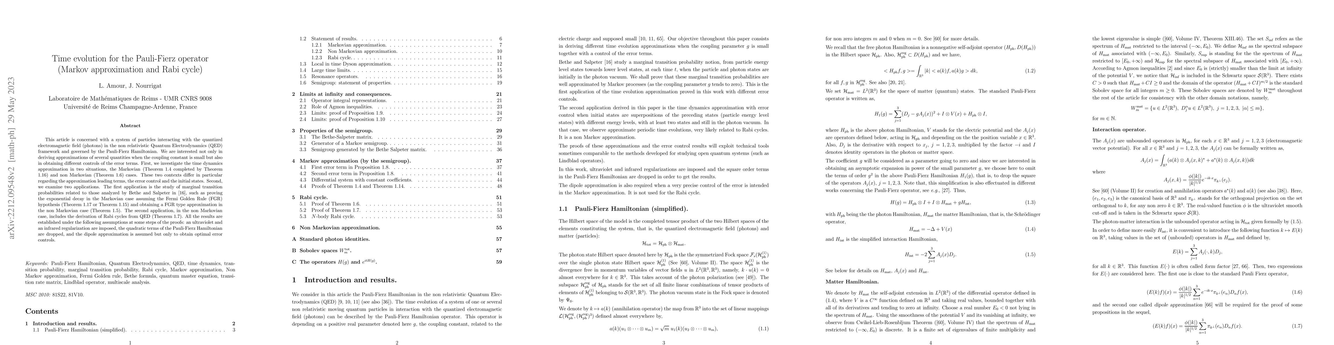 This paper explores the time evolution dynamics of particles interacting with photons in non-relativistic Quantum Electrodynamics, focusing on the Pauli-Fierz Hamiltonian. It derives approximations for various quantities under small coupling constants, comparing Markovian and non-Markovian scenarios, and applies these to study marginal transition probabilities and Rabi cycles.