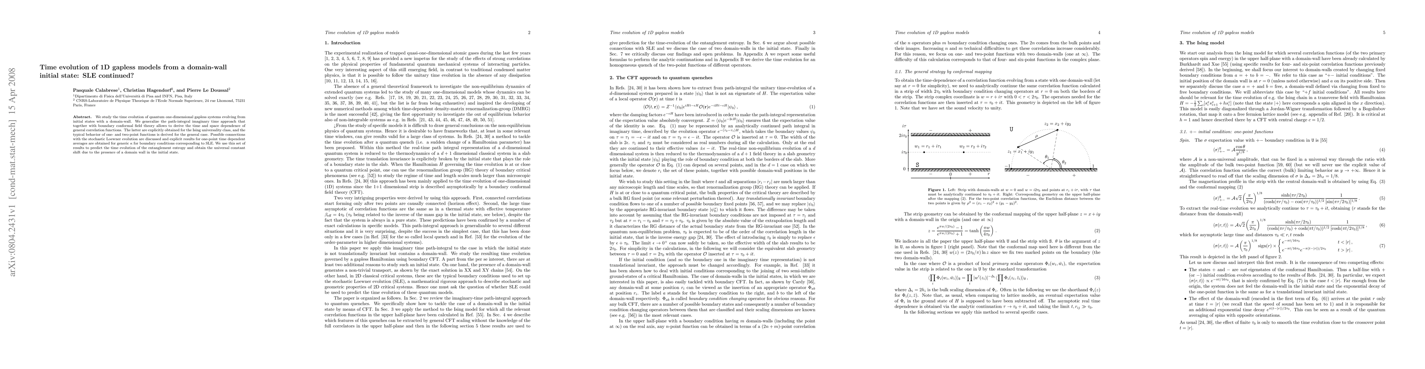 We study the time evolution of quantum one-dimensional gapless systems evolving from initial states with a domain-wall. We generalize the path-integral imaginary time approach that together with boundary conformal field theory allows to derive the time and space dependence of general correlation functions. The latter are explicitly obtained for the Ising universality class, and the typical behavior of one- and two-point functions is derived for the general case. Possible connections with the stochastic Loewner evolution are discussed and explicit results for one-point time dependent averages are obtained for generic \kappa for boundary conditions corresponding to SLE. We use this set of results to predict the time evolution of the entanglement entropy and obtain the universal constant shift due to the presence of a domain wall in the initial state.