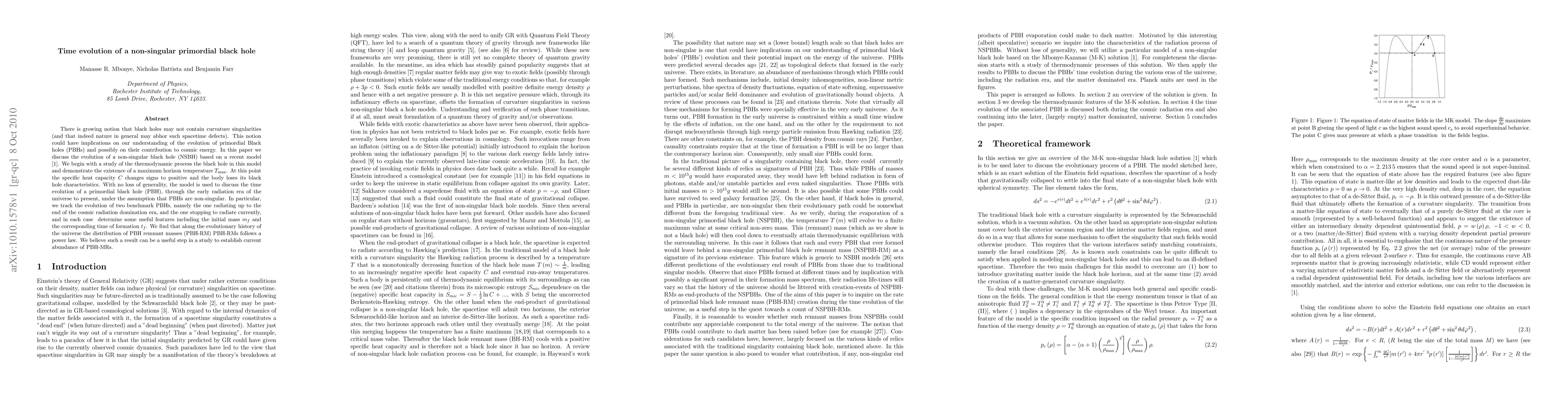 There is growing notion that black holes may not contain curvature singularities (and that indeed nature in general may abhor such spacetime defects). This notion could have implications on our understanding of the evolution of primordial black holes (PBHs) and possibly on their contribution to cosmic energy. This paper discusses the evolution of a non-singular black hole (NSBH) based on a recent model [1]. We begin with a study of the thermodynamic process of the black hole in this model, and demonstrate the existence of a maximum horizon temperature T_{max}, corresponding to a unique mass value. At this mass value the specific heat capacity C changes signs to positive and the body begins to lose its black hole characteristics. With no loss of generality, the model is used to discuss the time evolution of a primordial black hole (PBH), through the early radiation era of the universe to present, under the assumption that PBHs are non-singular. In particular, we track the evolution of two benchmark PBHs, namely the one radiating up to the end of the cosmic radiation domination era, and the one stopping to radiate currently, and in each case determine some useful features including the initial mass m_{f} and the corresponding time of formation t_{f}. It is found that along the evolutionary history of the universe the distribution of PBH remnant masses (PBH-RM) PBH-RMs follows a power law. We believe such a result can be a useful step in a study to establish current abundance of PBH-MRs.