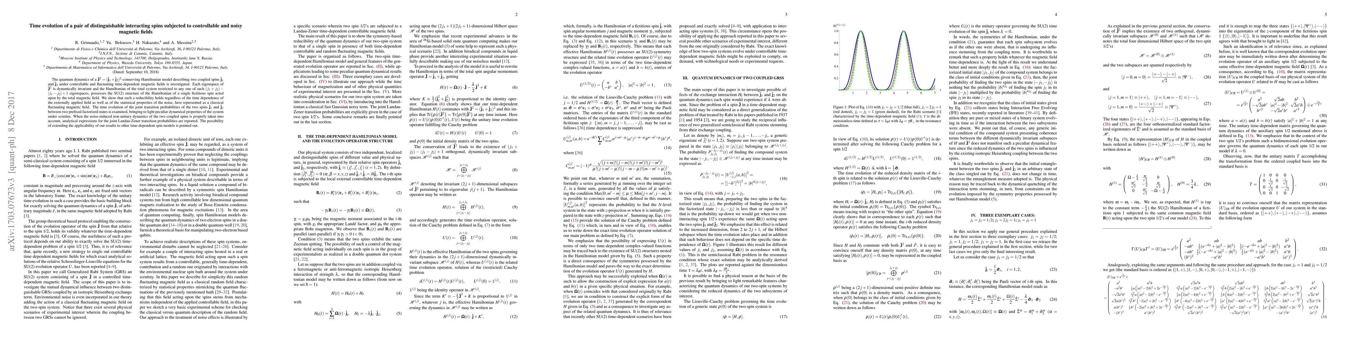 The quantum dynamics of a $\hat{\mathbf{J}}^2=(\hat{\mathbf{j}}_1+\hat{\mathbf{j}}_2)^2$-conserving Hamiltonian model describing two coupled spins $\hat{\mathbf{j}}_1$ and $\hat{\mathbf{j}}_2$ under controllable and fluctuating time-dependent magnetic fields is investigated. Each eigenspace of $\hat{\mathbf{J}}^2$ is dynamically invariant and the Hamiltonian of the total system restricted to any one of such $(j_1+j_2)-|j_1-j_2|+1$ eigenspaces, possesses the SU(2) structure of the Hamiltonian of a single fictitious spin acted upon by the total magnetic field. We show that such a reducibility holds regardless of the time dependence of the externally applied field as well as of the statistical properties of the noise, here represented as a classical fluctuating magnetic field. The time evolution of the joint transition probabilities of the two spins $\hat{\mathbf{j}}_1$ and $\hat{\mathbf{j}}_2$ between two prefixed factorized states is examined, bringing to light peculiar dynamical properties of the system under scrutiny. When the noise-induced non-unitary dynamics of the two coupled spins is properly taken into account, analytical expressions for the joint Landau-Zener transition probabilities are reported. The possibility of extending the applicability of our results to other time-dependent spin models is pointed out.