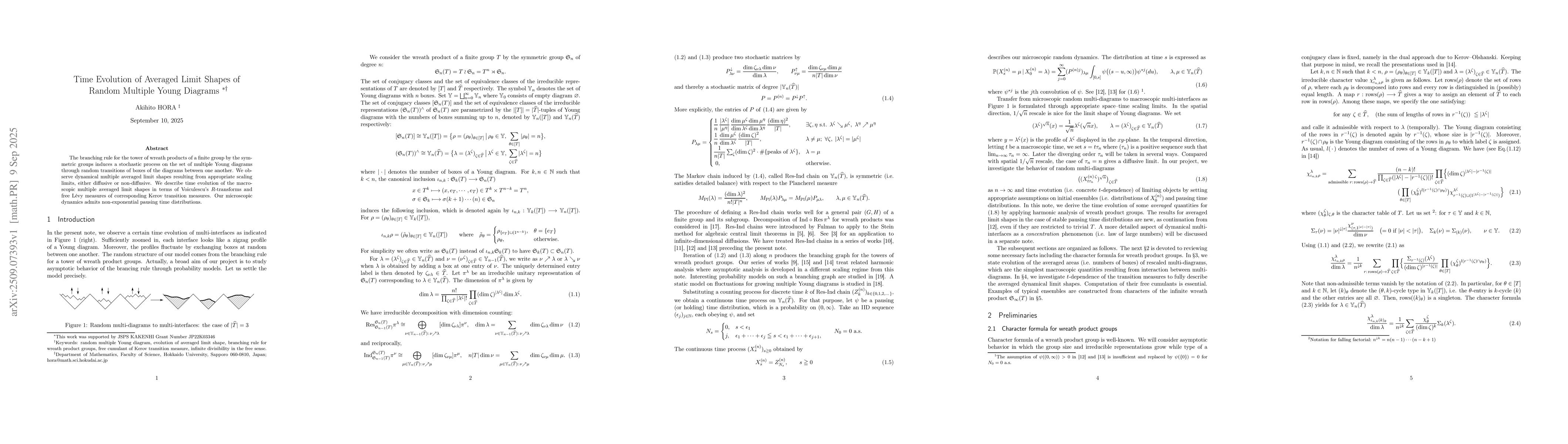 The branching rule for the tower of wreath products of a finite group by the symmetric groups induces a stochastic process on the set of multiple Young diagrams through random transitions of boxes of the diagrams between one another. We observe dynamical multiple averaged limit shapes resulting from appropriate scaling limits, either diffusive or non-diffusive. We describe time evolution of the macroscopic multiple averaged limit shapes in terms of Voiculescu's $R$-transforms and free L\'evy measures of corresponding Kerov transition measures. Our microscopic dynamics admits non-exponential pausing time distributions.