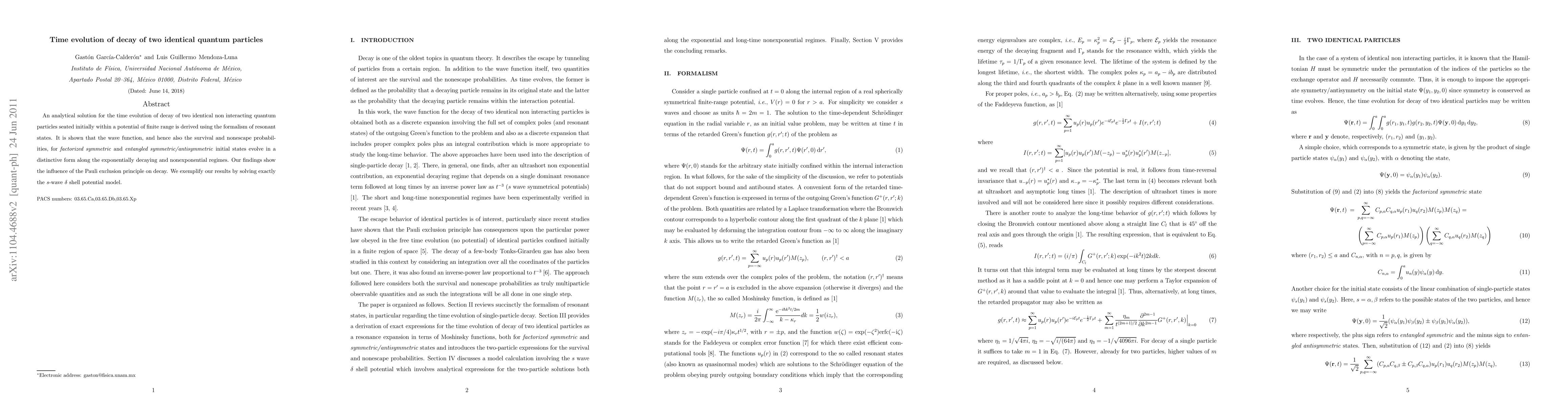 This paper derives an analytical solution for the time evolution of decay in two identical non-interacting quantum particles within a finite potential, revealing distinct evolution patterns for factorized and entangled states influenced by the Pauli exclusion principle. The s-wave delta shell potential model is used to exemplify these findings.