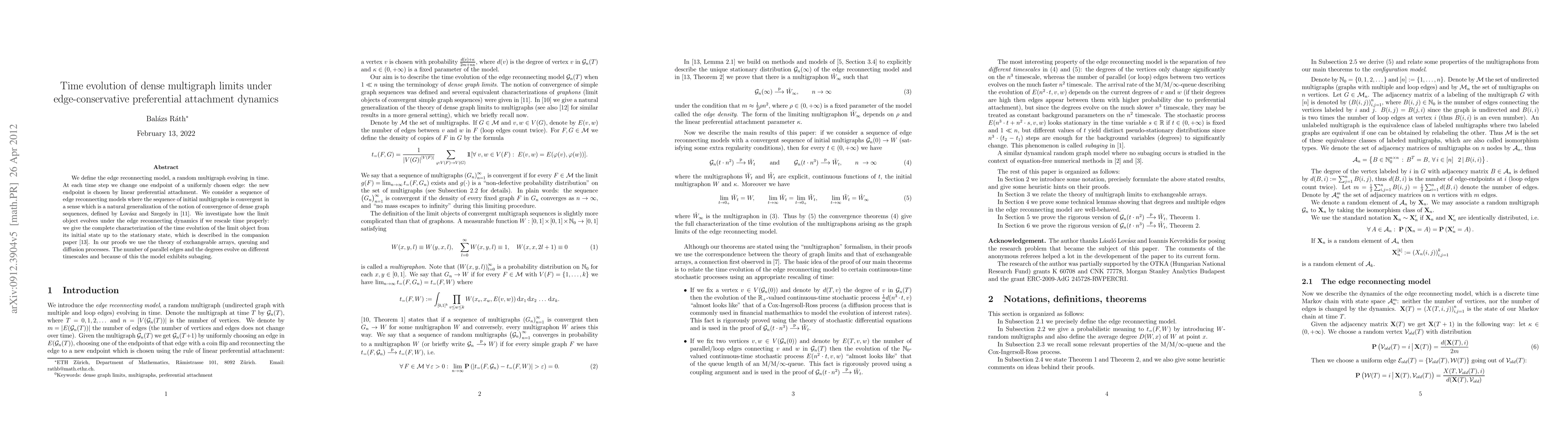 This paper studies the edge reconnecting model, a dynamic process for evolving dense multigraphs through edge-conservative preferential attachment. It characterizes the time evolution of the model's limit object, revealing distinct timescales for parallel edges and degree evolution, leading to subaging behavior.