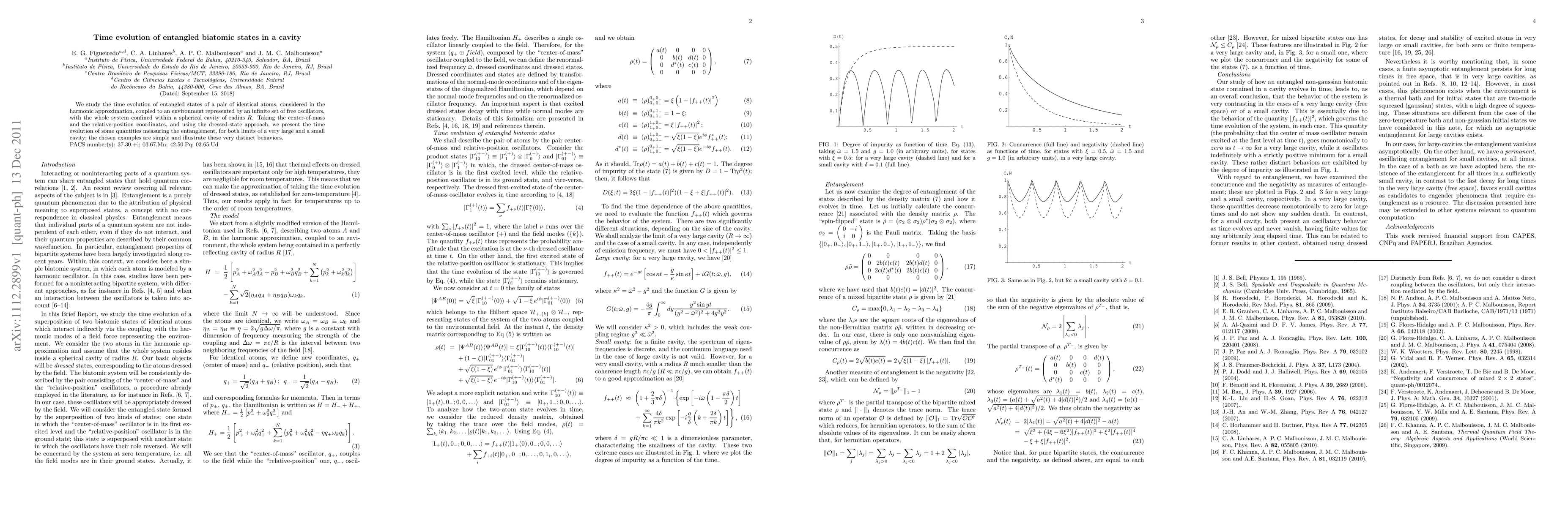 We study the time evolution of entangled states of a pair of identical atoms, considered in the harmonic approximation, coupled to an environment represented by an infinite set of free oscillators, with the whole system confined within a spherical cavity of radius $R$. Taking the center-of-mass and the relative-position coordinates, and using the dressed-state approach, we present the time evolution of some quantities measuring the entanglement, for both limits of a very large and a small cavity; the chosen examples are simple and illustrate these very distinct behaviors.