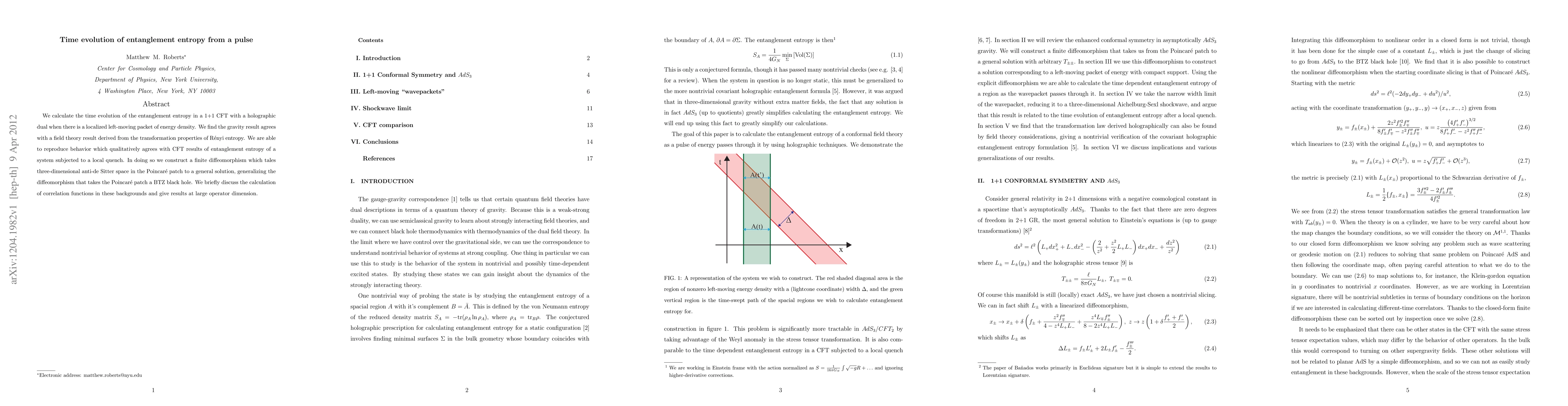 We calculate the time evolution of the entanglement entropy in a 1+1 CFT with a holographic dual when there is a localized left-moving packet of energy density. We find the gravity result agrees with a field theory result derived from the transformation properties of R\'enyi entropy. We are able to reproduce behavior which qualitatively agrees with CFT results of entanglement entropy of a system subjected to a local quench. In doing so we construct a finite diffeomorphism which tales three-dimensional anti-de Sitter space in the Poincar\'e patch to a general solution, generalizing the diffeomorphism that takes the Poincar\'e patch a BTZ black hole. We briefly discuss the calculation of correlation functions in these backgrounds and give results at large operator dimension.
