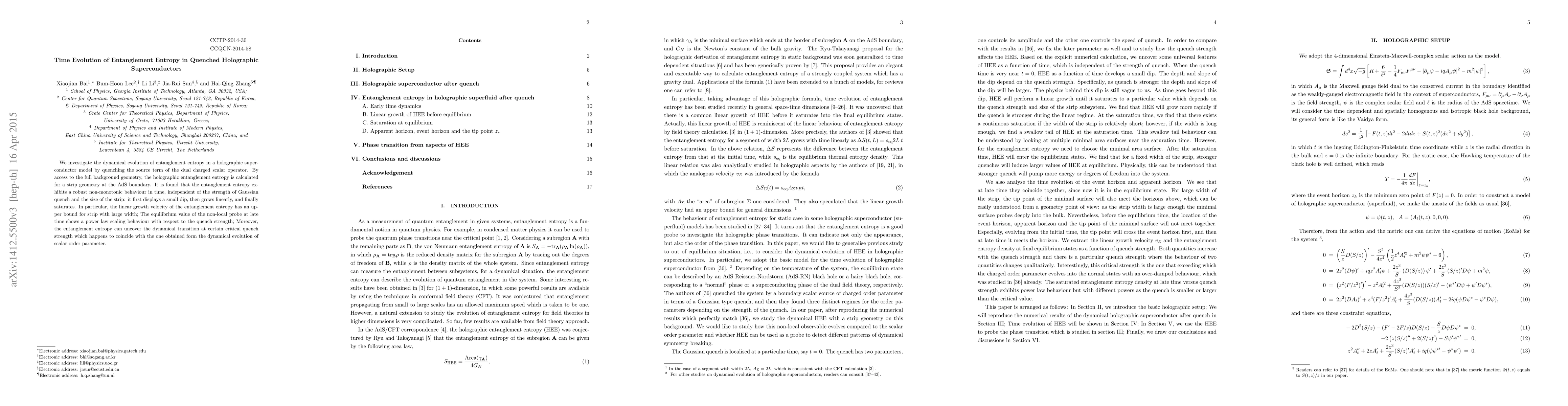 This paper examines the time evolution of entanglement entropy in a holographic superconductor model following a rapid change (quench) in the source term of a charged scalar operator. The study reveals a non-monotonic time behavior of the entanglement entropy, characterized by an initial dip, followed by linear growth, and eventual saturation, with a critical quench strength marking a dynamical transition.