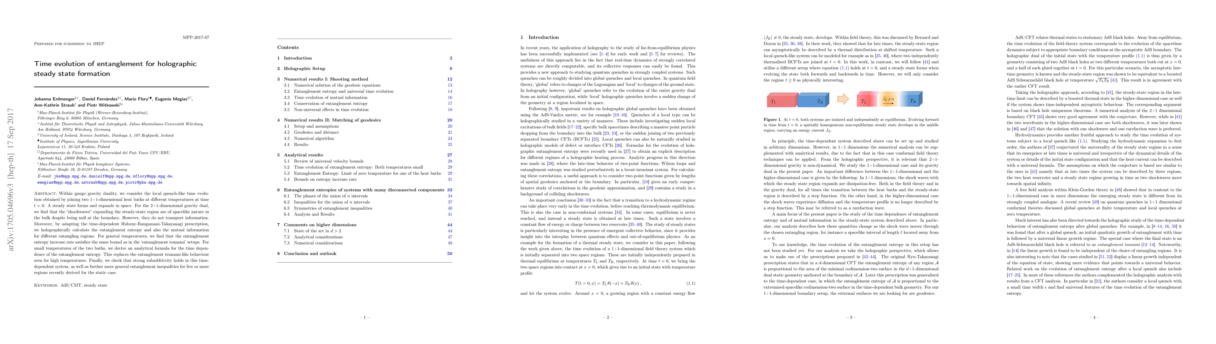 Within gauge/gravity duality, we consider the local quench-like time evolution obtained by joining two 1+1-dimensional heat baths at different temperatures at time t=0. A steady state forms and expands in space. For the 2+1-dimensional gravity dual, we find that the shockwaves expanding the steady-state region are of spacelike nature in the bulk despite being null at the boundary. However, they do not transport information. Moreover, by adapting the time-dependent Hubeny-Rangamani-Takayanagi prescription, we holographically calculate the entanglement entropy and also the mutual information for different entangling regions. For general temperatures, we find that the entanglement entropy increase rate satisfies the same bound as in the "entanglement tsunami" setups. For small temperatures of the two baths, we derive an analytical formula for the time dependence of the entanglement entropy. This replaces the entanglement tsunami-like behaviour seen for high temperatures. Finally, we check that strong subadditivity holds in this time-dependent system, as well as further more general entanglement inequalities for five or more regions recently derived for the static case.