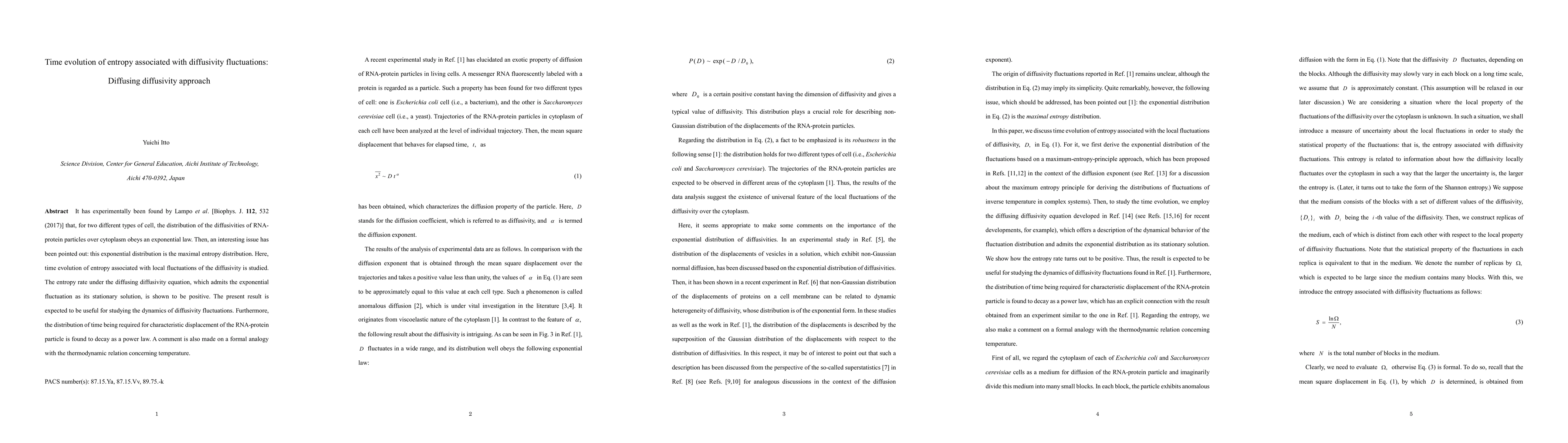It has experimentally been found by Lampo et al. [Biophys. J. 112, 532 (2017)] that, for two different types of cell, the distribution of the diffusivities of RNA-protein particles over cytoplasm obeys an exponential law. Then, an interesting issue has been pointed out: this exponential distribution is the maximal entropy distribution. Here, time evolution of entropy associated with local fluctuations of the diffusivity is studied. The entropy rate under the diffusing diffusivity equation, which admits the exponential fluctuation as its stationary solution, is shown to be positive. The present result is expected to be useful for studying the dynamics of diffusivity fluctuations. Furthermore, the distribution of time being required for characteristic displacement of the RNA-protein particle is found to decay as a power law. A comment is also made on a formal analogy with the thermodynamic relation concerning temperature.
