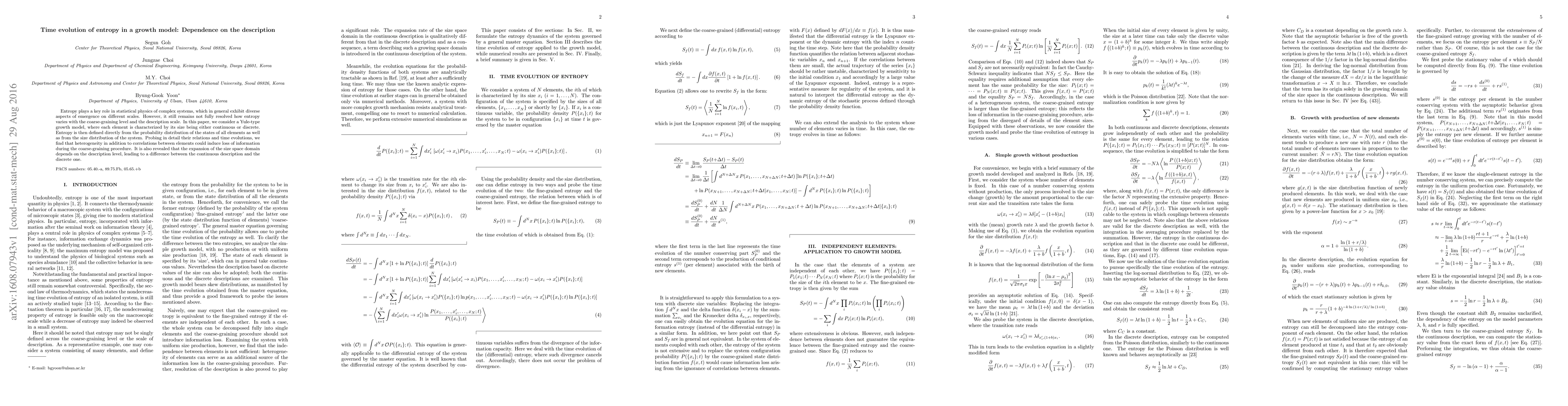Entropy plays a key role in statistical physics of complex systems, which in general exhibit diverse aspects of emergence on different scales. However, it still remains not fully resolved how entropy varies with the coarse-graining level and the description scale. In this paper, we consider a Yule-type growth model, where each element is characterized by its size being either continuous or discrete. Entropy is then defined directly from the probability distribution of the states of all elements as well as from the size distribution of the system. Probing in detail their relations and time evolutions, we find that heterogeneity in addition to correlations between elements could induce loss of information during the coarse-graining procedure. It is also revealed that the expansion of the size space domain depends on the description level, leading to a difference between the continuous description and the discrete one.