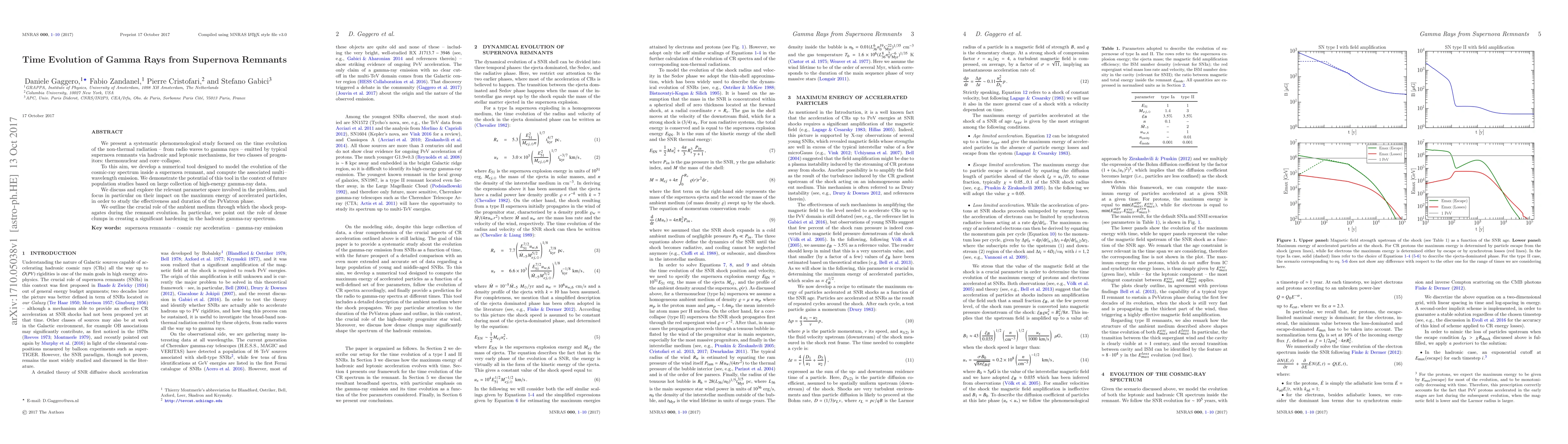 This study introduces a numerical tool modeling cosmic-ray spectrum evolution in supernova remnants, examining non-thermal radiation from radio to gamma rays via hadronic and leptonic processes for different progenitor types. It explores the parameter space impact on particle acceleration, PeVatron phase effectiveness, and ambient medium influence, highlighting dense clumps' role in hardening hadronic gamma-ray spectra.