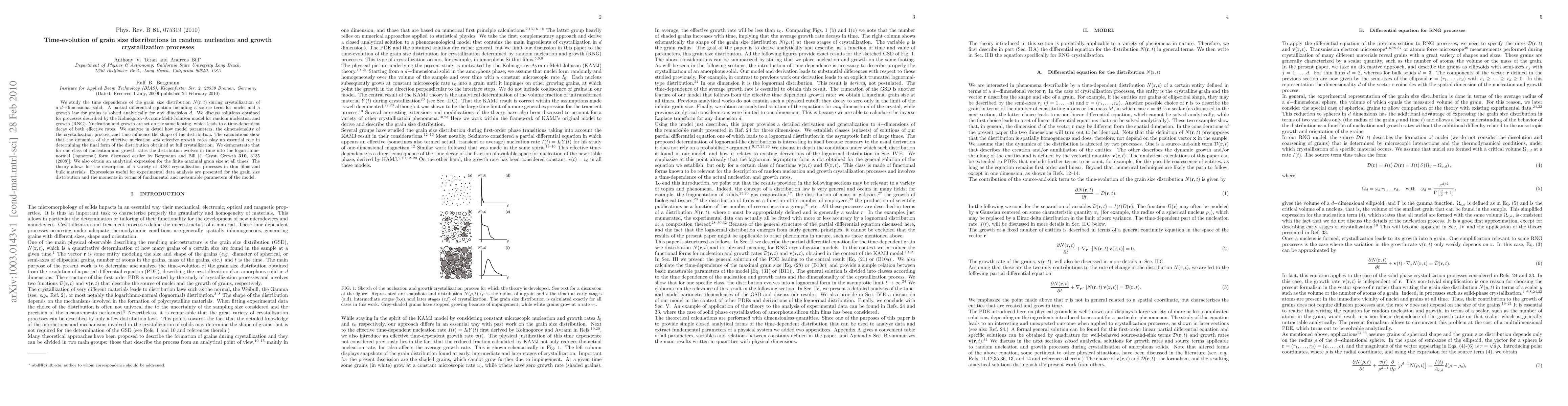 This paper analytically solves a partial differential equation to study the time-evolution of grain size distributions during random nucleation and growth crystallization in any dimension, revealing the influence of dynamic nucleation and growth rates on the final grain size distribution. The results demonstrate the evolution into a lognormal form and provide expressions for grain size distribution and moments for experimental analysis.