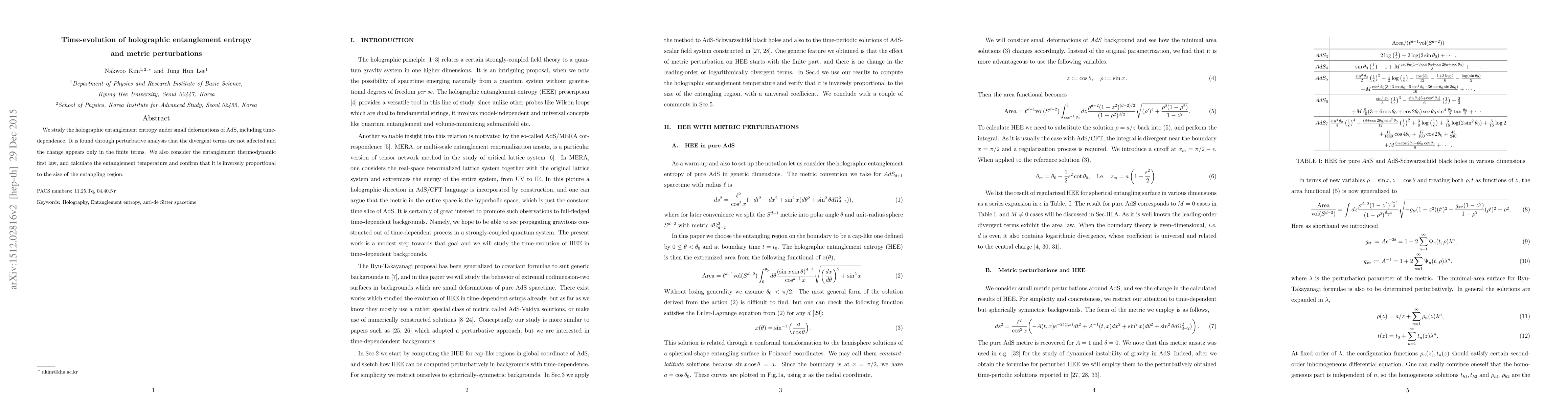 We study the holographic entanglement entropy under small deformations of AdS, including time-dependence. It is found through perturbative analysis that the divergent terms are not affected and the change appears only in the finite terms. We also consider the entanglement thermodynamic first law, and calculate the entanglement temperature and confirm that it is inversely proportional to the size of the entangling region.