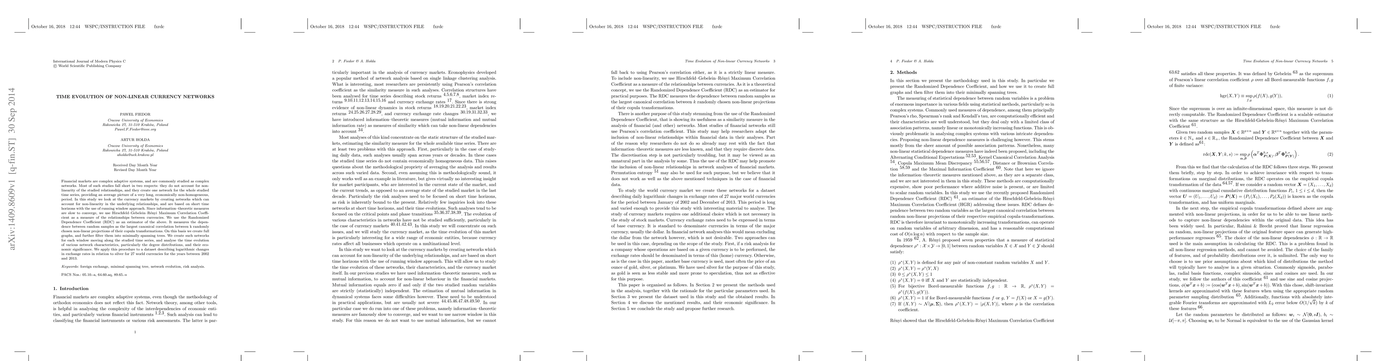 Financial markets are complex adaptive systems, and are commonly studied as complex networks. Most of such studies fall short in two respects: they do not account for non-linearity of the studied relationships, and they create one network for the whole studied time series, providing an average picture of a very long, economically non-homogeneous, period. In this study we look at the currency markets by creating networks which can account for non-linearity in the underlying relationships, and are based on short time horizons with the use of running window approach. Since information--theoretic measures are slow to converge, we use Hirschfeld-Gebelein-Renyi Maximum Correlation Coefficient as a measure of the relationships between currencies. We use the Randomized Dependence Coefficient (RDC) as an estimator of the above. It measures the dependence between random samples as the largest canonical correlation between k randomly chosen non-linear projections of their copula transformations. On this basis we create full graphs, and further filter them into minimally spanning trees. We create such networks for each window moving along the studied time series, and analyse the time evolution of various network characteristics, particularly the degree distributions, and their economic significance. We apply this procedure to a dataset describing logarithmic changes in exchange rates in relation to silver for 27 world currencies for the years between 2002 and 2013.