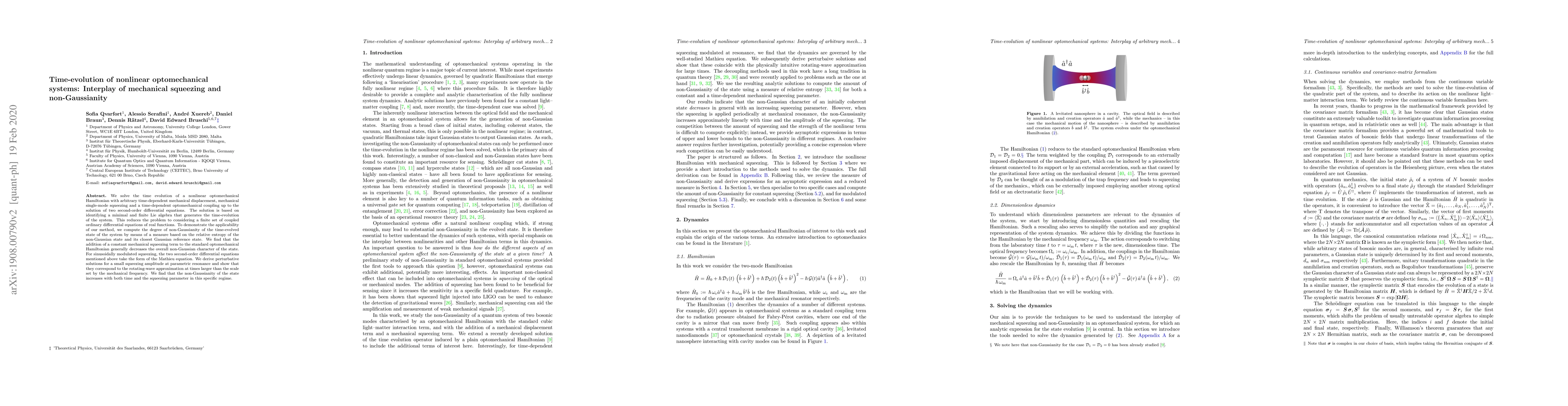 We solve the time evolution of a nonlinear optomechanical Hamiltonian with arbitrary time-dependent mechanical displacement, mechanical single-mode squeezing and a time-dependent optomechanical coupling up to the solution of two second-order differential equations. The solution is based on identifying a minimal and finite Lie algebra that generates the time-evolution of the system. This reduces the problem to considering a finite set of coupled ordinary differential equations of real functions. To demonstrate the applicability of our method, we compute the degree of non-Gaussianity of the time-evolved state of the system by means of a measure based on the relative entropy of the non-Gaussian state and its closest Gaussian reference state. We find that the addition of a constant mechanical squeezing term to the standard optomechanical Hamiltonian generally decreases the overall non-Gaussian character of the state. For sinusoidally modulated squeezing, the two second-order differential equations mentioned above take the form of the Mathieu equation. We derive perturbative solutions for a small squeezing amplitude at parametric resonance and show that they correspond to the rotating-wave approximation at times larger than the scale set by the mechanical frequency. We find that the non-Gaussianity of the state increases with both time and the squeezing parameter in this specific regime.