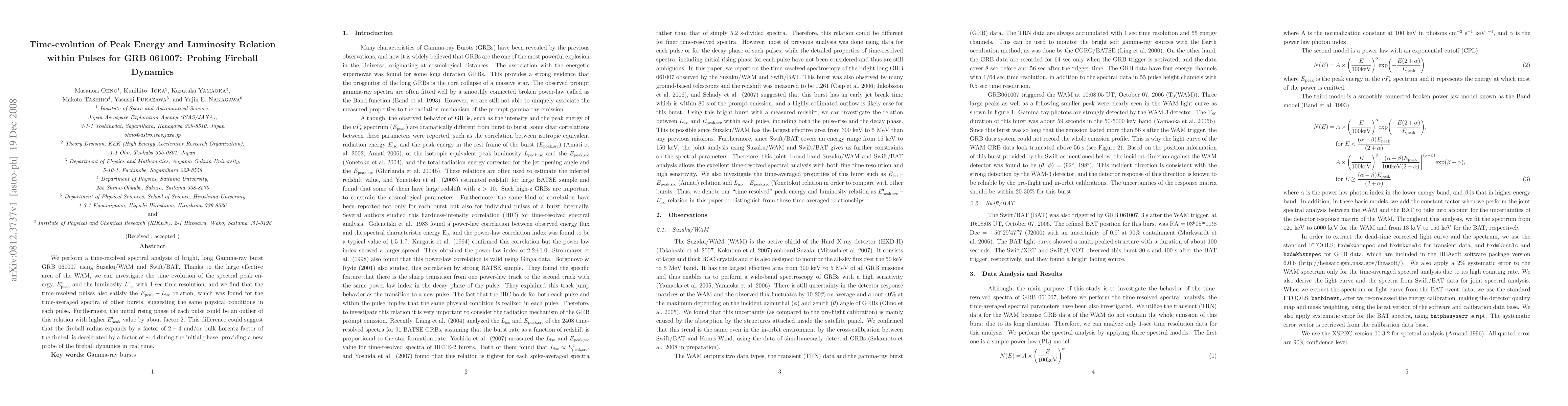 We perform a time-resolved spectral analysis of bright, long Gamma-ray burst GRB 061007 using Suzaku/WAM and Swift/BAT. Thanks to the large effective area of the WAM, we can investigate the time evolution of the spectral peak energy, Et_peak and the luminosity Lt_iso with 1-sec time resolution, and we find that luminosity Lt_iso with 1-sec time resolution, and we find that the time-resolved pulses also satisfy the Epeak-Liso relation, which was found for the time-averaged spectra of other bursts, suggesting the same physical conditions in each pulse. Furthermore, the initial rising phase of each pulse could be an outlier of this relation with higher Et_peak value by about factor 2. This difference could suggest that the fireball radius expands by a factor of 2-4 and/or bulk Lorentz factor of the fireball is decelerated by a factor of 4 during the initial phase, providing a new probe of the fireball dynamics in real time.
