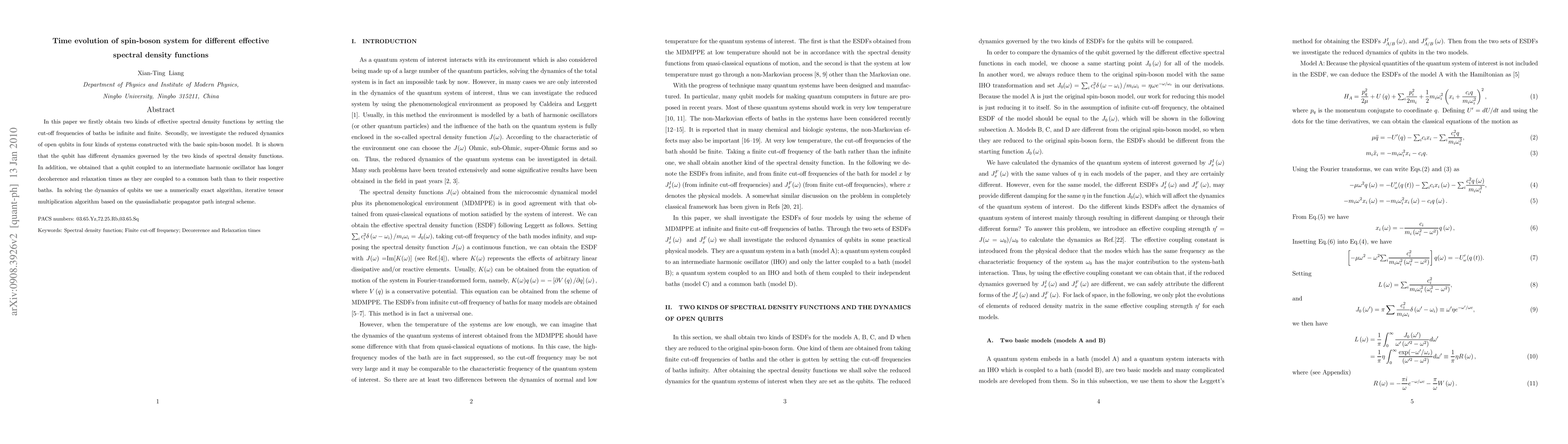 This paper explores the time evolution of spin-boson systems using two types of effective spectral density functions, derived from infinite and finite cut-off frequencies. It investigates the dynamics of qubits in four spin-boson models, revealing distinct qubit behaviors governed by the spectral density functions and longer decoherence times for qubits coupled to a common bath.