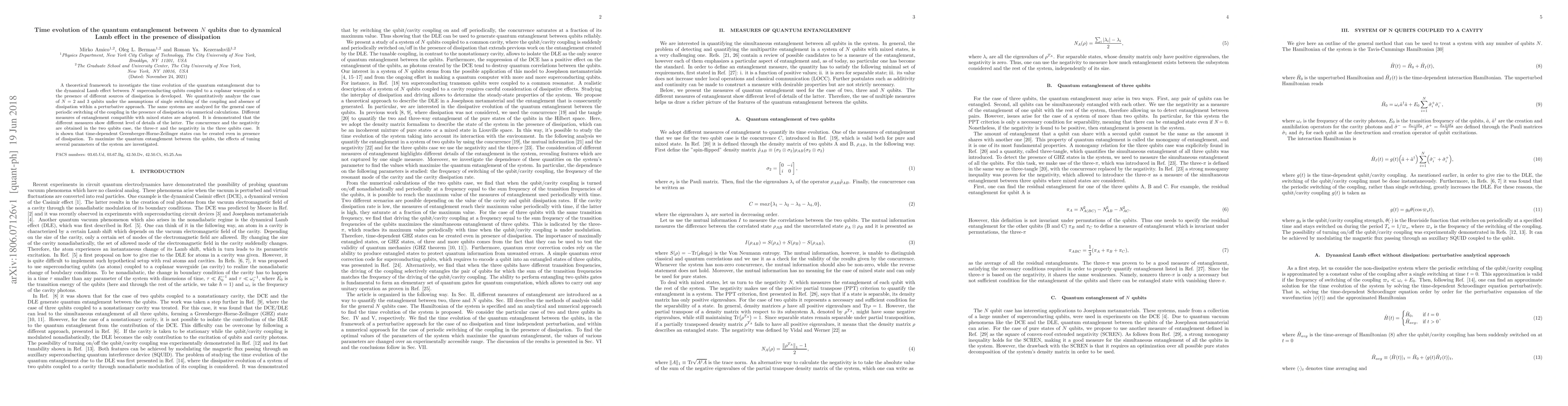 A theoretical framework to investigate the time evolution of the quantum entanglement due to the dynamical Lamb effect between $N$ superconducting qubits coupled to a coplanar waveguide in the presence of different sources of dissipation is developed. We quantitatively analyze the case of $N=2$ and $3$ qubits under the assumptions of single switching of the coupling and absence of dissipation within a perturbative approach. The same systems are analyzed for the general case of periodic switching of the coupling in the presence of dissipation via numerical calculations. Different measures of entanglement compatible with mixed states are adopted. It is demonstrated that the different measures show different level of details of the latter. The concurrence and the negativity are obtained in the two qubits case, the three-$\pi$ and the negativity in the three qubits case. It is shown that time-dependent Greenberger-Horne-Zeilinger states can be created even in presence of dissipation. To maximize the quantum entanglement between the qubits, the effects of tuning several parameters of the system are investigated.