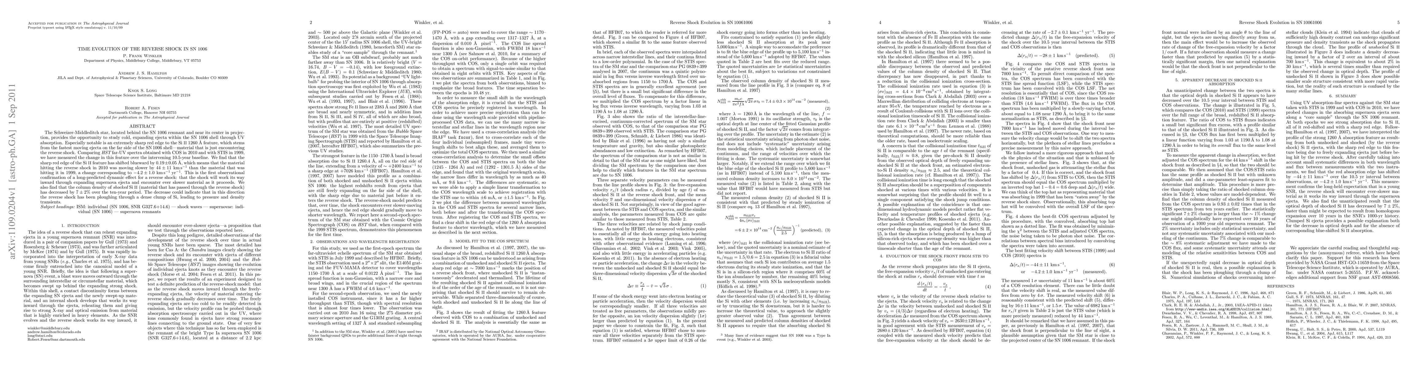This paper investigates the time evolution of the reverse shock in the SN 1006 supernova remnant using HST spectra from 1999 and 2010. The study finds that the reverse shock encounters slower-moving material over time, confirming a long-predicted dynamic effect, and notes a 7% decrease in shocked Si II column density over ten years, suggesting interactions with dense Si clumps.
