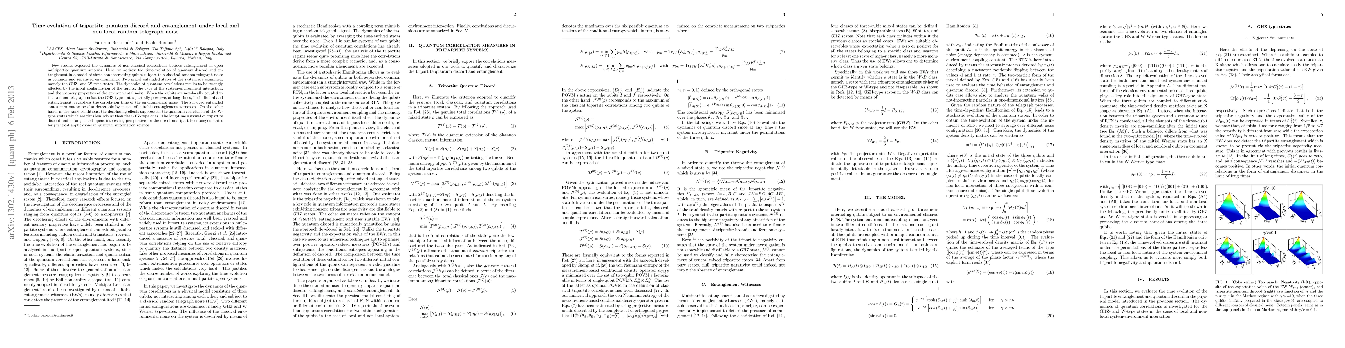 This paper investigates the time-evolution of quantum discord and entanglement in tripartite qubit systems under local and non-local random telegraph noise. It finds that GHZ-type states better preserve quantum correlations compared to W-type states, suggesting potential applications in quantum information science.