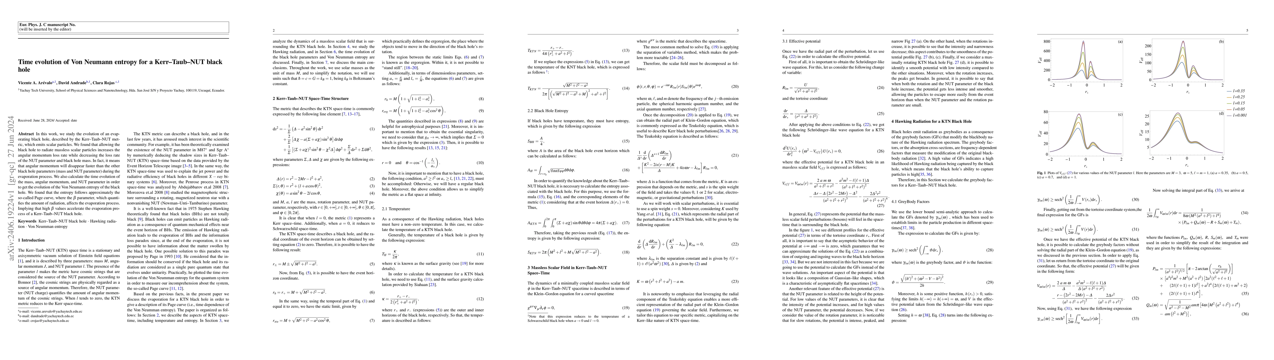 This study investigates the time evolution of Von Neumann entropy in a Kerr-Taub-NUT black hole emitting scalar particles, finding that angular momentum evaporates faster than mass and NUT parameters, and the entropy follows a Page curve influenced by radiation quantified by the $\beta$ parameter.