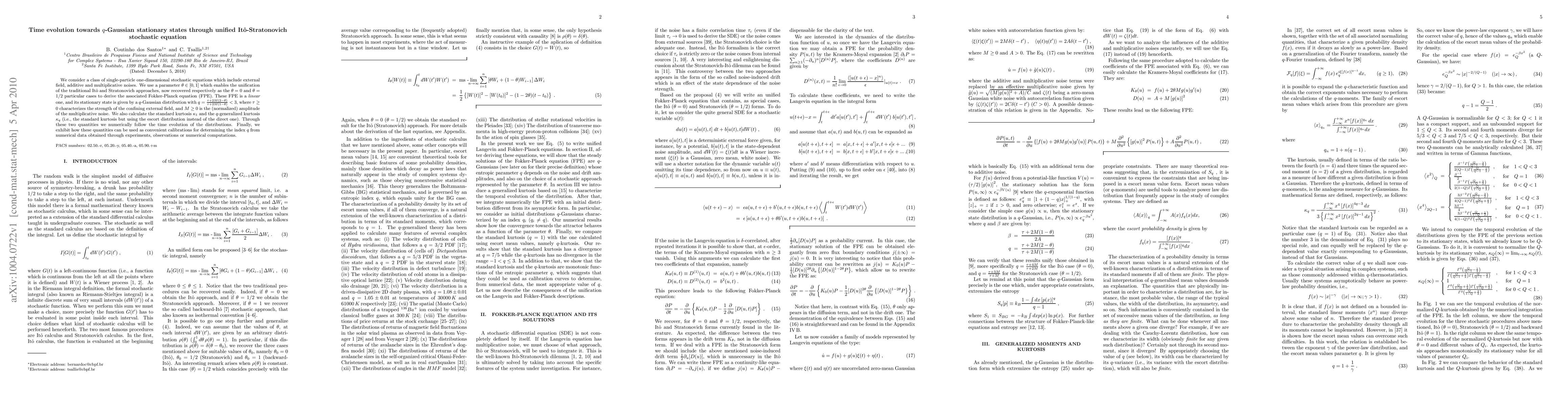 We consider a class of single-particle one-dimensional stochastic equations which include external field, additive and multiplicative noises. We use a parameter $\theta \in [0,1]$ which enables the unification of the traditional It\^o and Stratonovich approaches, now recovered respectively as the $\theta=0$ and $\theta=1/2$ particular cases to derive the associated Fokker-Planck equation (FPE). These FPE is a {\it linear} one, and its stationary state is given by a $q$-Gaussian distribution with $q = \frac{\tau + 2M (2 - \theta)}{\tau + 2M (1 - \theta)}<3$, where $\tau \ge 0$ characterizes the strength of the confining external field, and $M \ge 0$ is the (normalized) amplitude of the multiplicative noise. We also calculate the standard kurtosis $\kappa_1$ and the $q$-generalized kurtosis $\kappa_q$ (i.e., the standard kurtosis but using the escort distribution instead of the direct one). Through these two quantities we numerically follow the time evolution of the distributions. Finally, we exhibit how these quantities can be used as convenient calibrations for determining the index $q$ from numerical data obtained through experiments, observations or numerical computations.