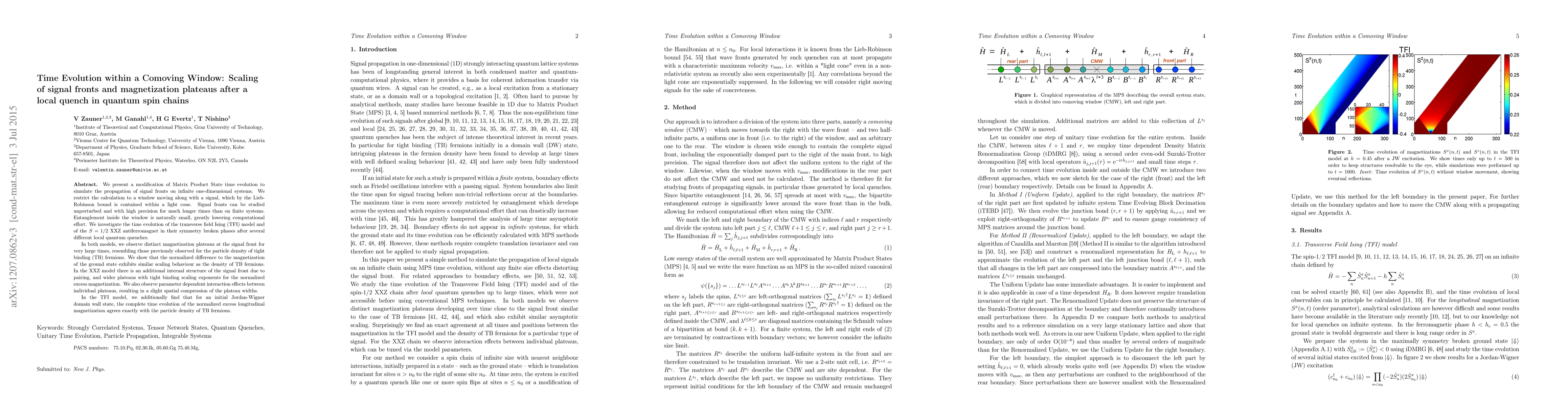 We present a modification of Matrix Product State time evolution to simulate the propagation of signal fronts on infinite one-dimensional systems. We restrict the calculation to a window moving along with a signal, which by the Lieb-Robinson bound is contained within a light cone. Signal fronts can be studied unperturbed and with high precision for much longer times than on finite systems. Entanglement inside the window is naturally small, greatly lowering computational effort. We investigate the time evolution of the transverse field Ising (TFI) model and of the S=1/2 XXZ antiferromagnet in their symmetry broken phases after several different local quantum quenches. In both models, we observe distinct magnetization plateaus at the signal front for very large times, resembling those previously observed for the particle density of tight binding (TB) fermions. We show that the normalized difference to the magnetization of the ground state exhibits similar scaling behaviour as the density of TB fermions. In the XXZ model there is an additional internal structure of the signal front due to pairing, and wider plateaus with tight binding scaling exponents for the normalized excess magnetization. We also observe parameter dependent interaction effects between individual plateaus, resulting in a slight spatial compression of the plateau widths. In the TFI model, we additionally find that for an initial Jordan-Wigner domain wall state, the complete time evolution of the normalized excess longitudinal magnetization agrees exactly with the particle density of TB fermions.