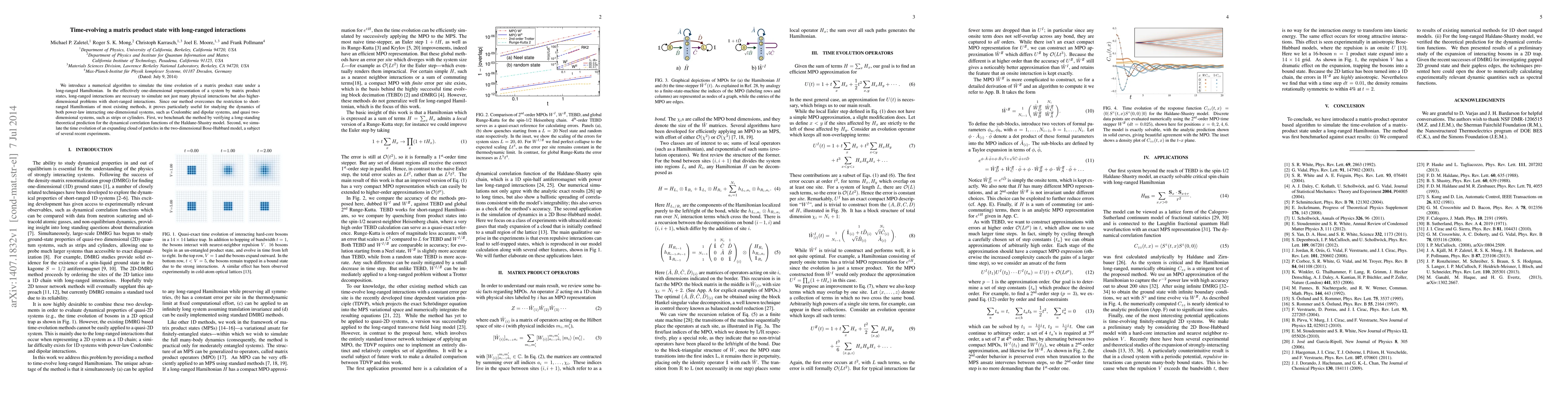This paper introduces a numerical algorithm to simulate the time evolution of matrix product states under long-ranged Hamiltonians, overcoming limitations of existing methods. The method is benchmarked by verifying theoretical predictions for the Haldane-Shastry model and simulating particle dynamics in the two-dimensional Bose-Hubbard model.