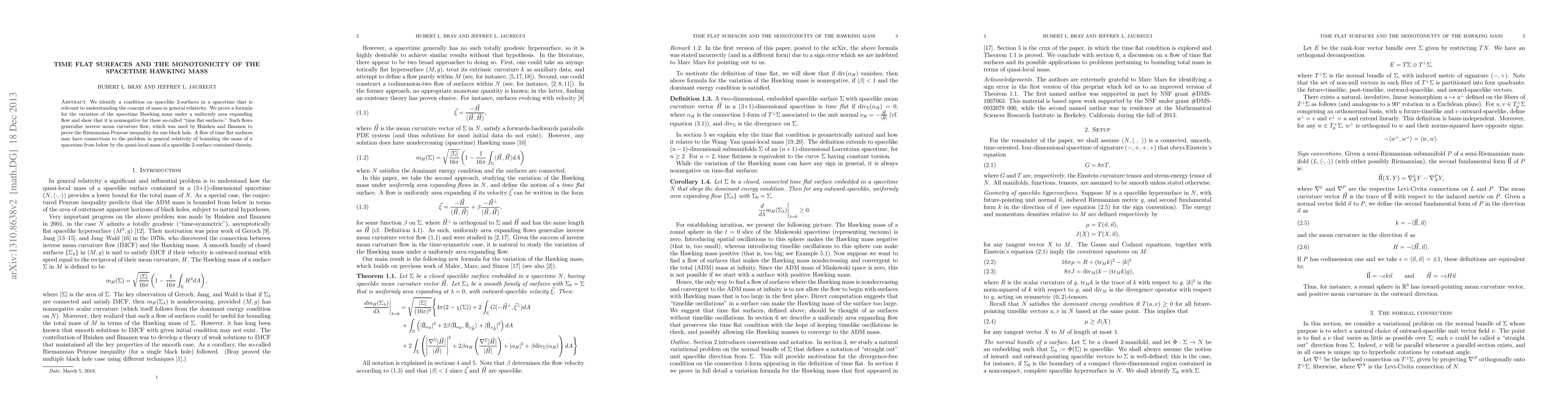 We identify a condition on spacelike 2-surfaces in a spacetime that is relevant to understanding the concept of mass in general relativity. We prove a formula for the variation of the spacetime Hawking mass under a uniformly area expanding flow and show that it is nonnegative for these so-called "time flat surfaces." Such flows generalize inverse mean curvature flow, which was used by Huisken and Ilmanen to prove the Riemannian Penrose inequality for one black hole. A flow of time flat surfaces may have connections to the problem in general relativity of bounding the mass of a spacetime from below by the quasi-local mass of a spacelike 2-surface contained therein.
