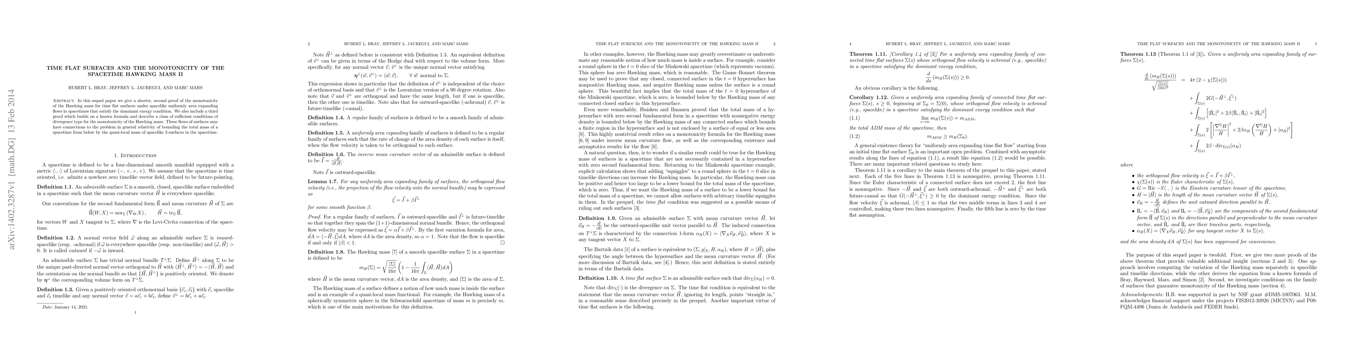 In this sequel paper we give a shorter, second proof of the monotonicity of the Hawking mass for time flat surfaces under spacelike uniformly area expanding flows in spacetimes that satisfy the dominant energy condition. We also include a third proof which builds on a known formula and describe a class of sufficient conditions of divergence type for the monotonicity of the Hawking mass. These flows of surfaces may have connections to the problem in general relativity of bounding the total mass of a spacetime from below by the quasi-local mass of spacelike 2-surfaces in the spacetime.