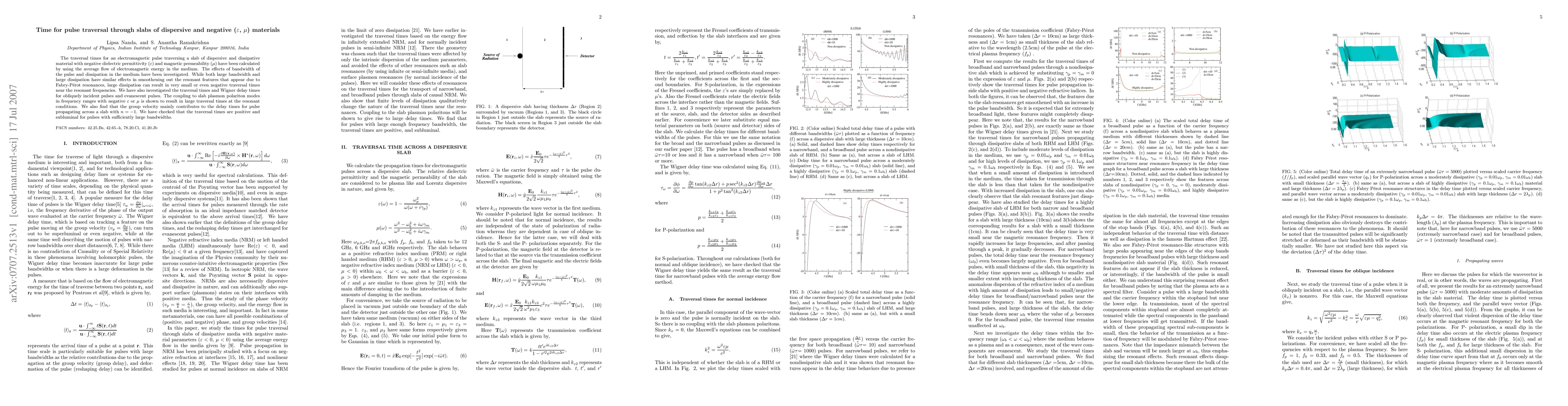 This paper calculates electromagnetic pulse traversal times through dispersive and negative permittivity/permeability materials, finding that large bandwidth and dissipation smooth out resonant features. It also examines oblique and evanescent pulses, revealing large traversal times due to slab plasmon polariton modes, and confirms that traversal times remain positive and subluminal for sufficiently large bandwidths.