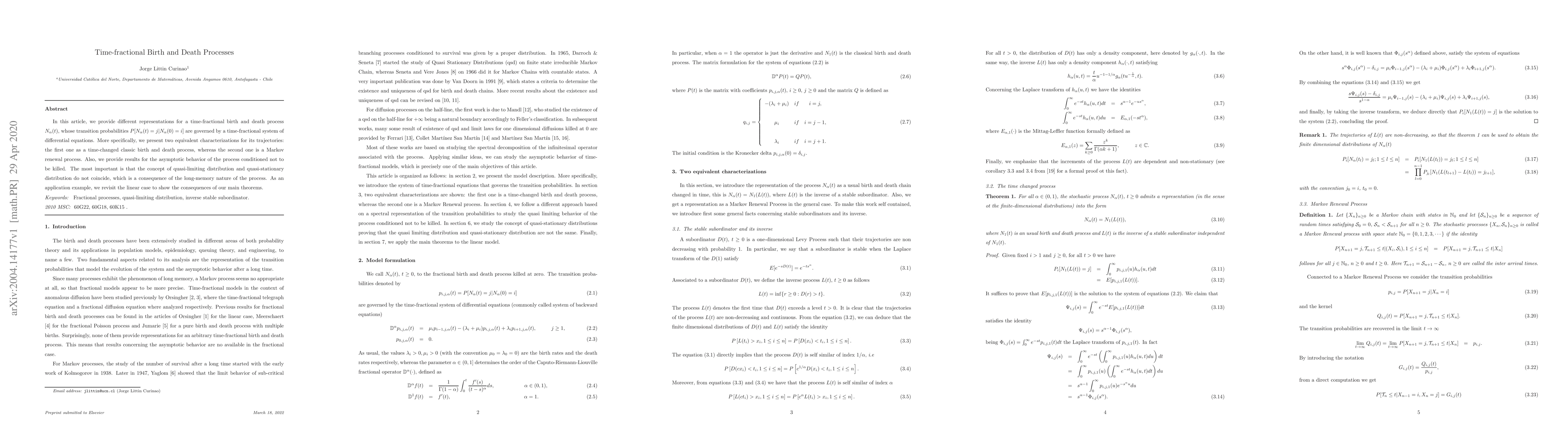 This paper explores time-fractional birth and death processes, presenting two equivalent characterizations: a time-changed classic birth and death process and a Markov renewal process. It highlights the non-coincidence of quasi-limiting and quasi-stationary distributions due to the process's long-memory nature.
