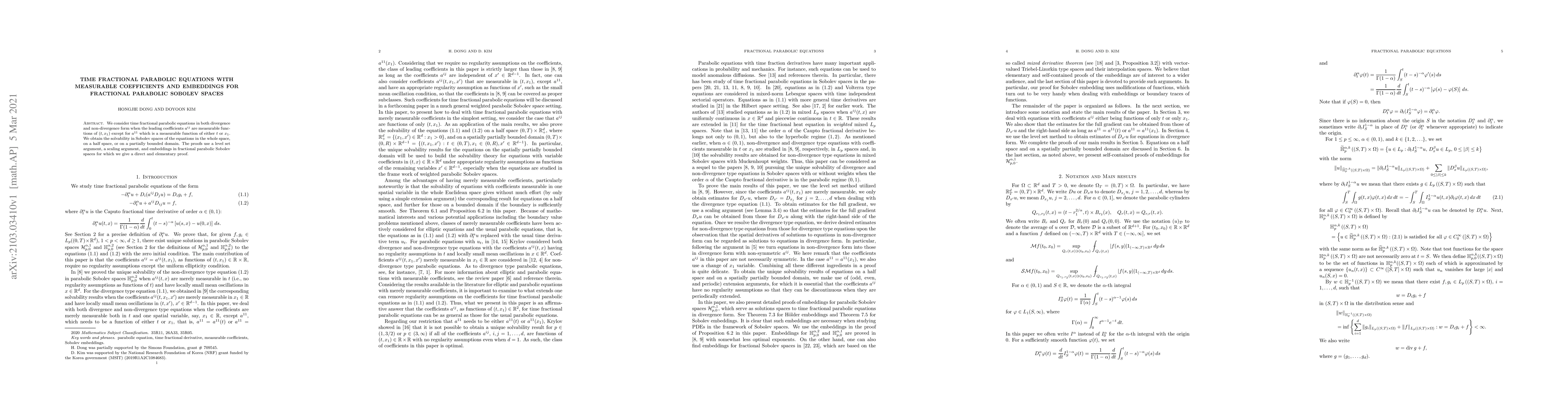 This paper investigates time fractional parabolic equations with measurable coefficients, focusing on both divergence and non-divergence forms. The authors establish solvability in fractional parabolic Sobolev spaces across various domains, employing level set, scaling arguments, and providing a direct proof for embeddings.