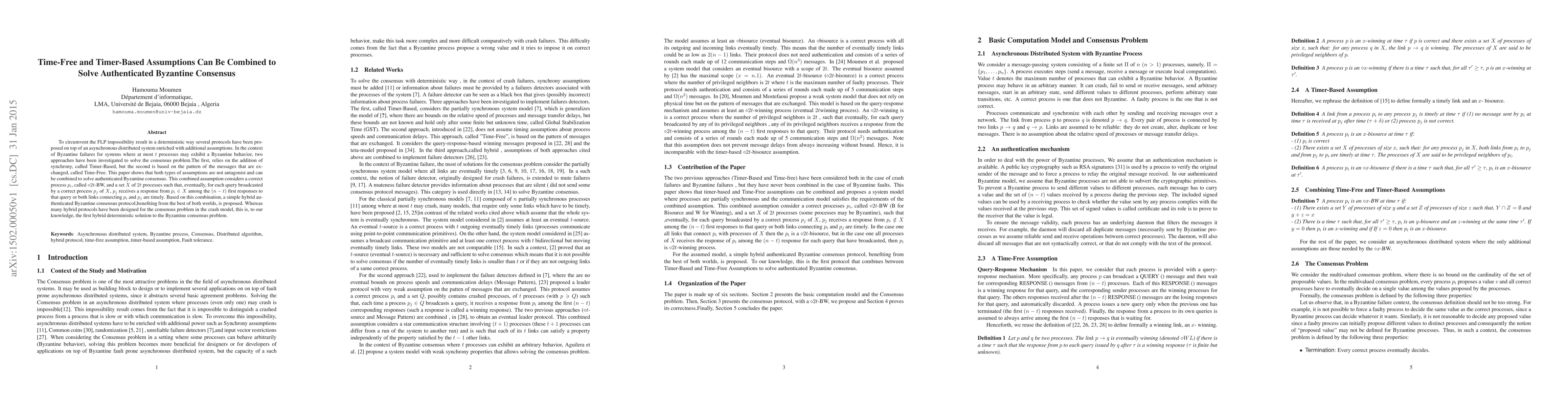 This paper proposes a hybrid protocol combining time-free and timer-based assumptions to solve authenticated Byzantine consensus, overcoming the FLP impossibility result in asynchronous systems. The combined 2t-BW assumption leverages both timely links and message patterns to achieve consensus, offering a novel deterministic solution to the Byzantine consensus problem.