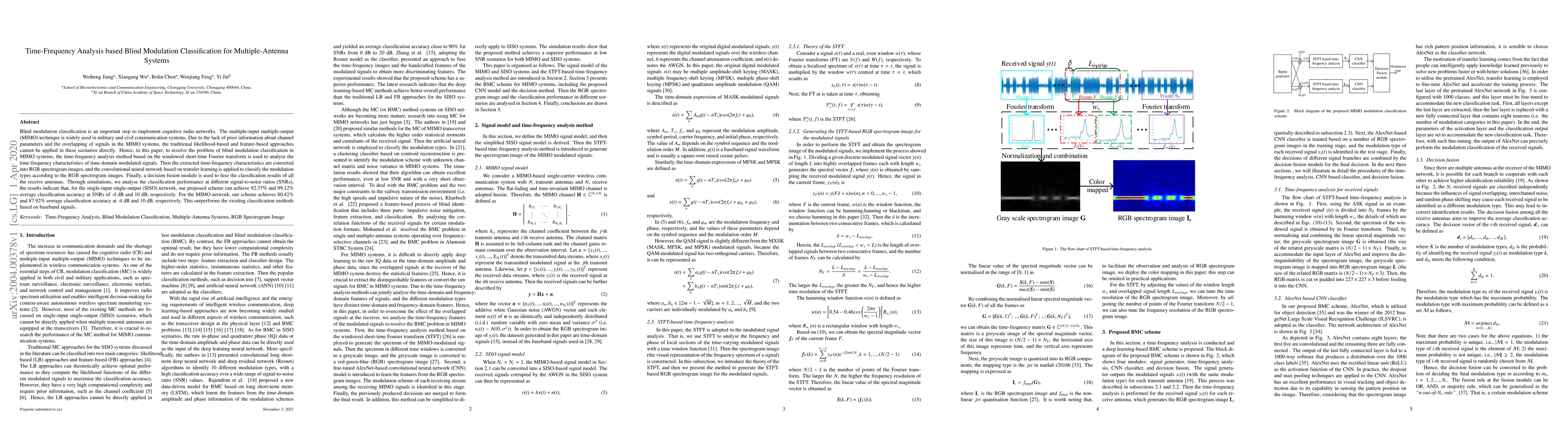 This paper proposes a time-frequency analysis method using windowed short-time Fourier transform for blind modulation classification in MIMO systems. It employs RGB spectrogram images and a convolutional neural network with transfer learning to classify modulation types, achieving higher accuracy than existing methods.