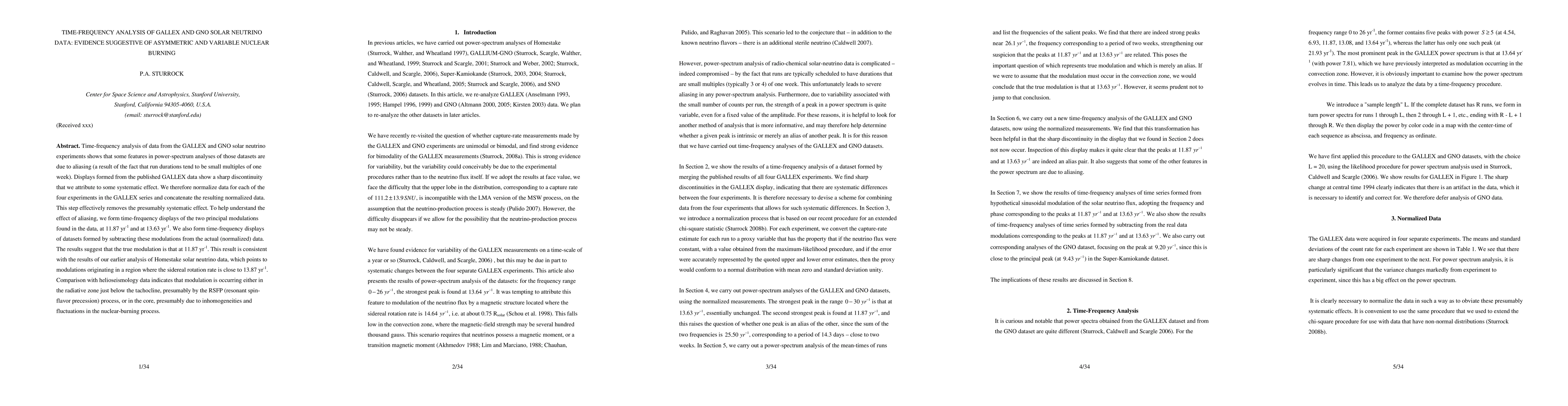 This paper uses time-frequency analysis on GALLEX and GNO solar neutrino data to identify modulations, suggesting asymmetric and variable nuclear burning. The analysis reveals a dominant modulation at 11.87 yr-1, likely caused by RSFP or nuclear-burning fluctuations, supported by comparison with helioseismology data.