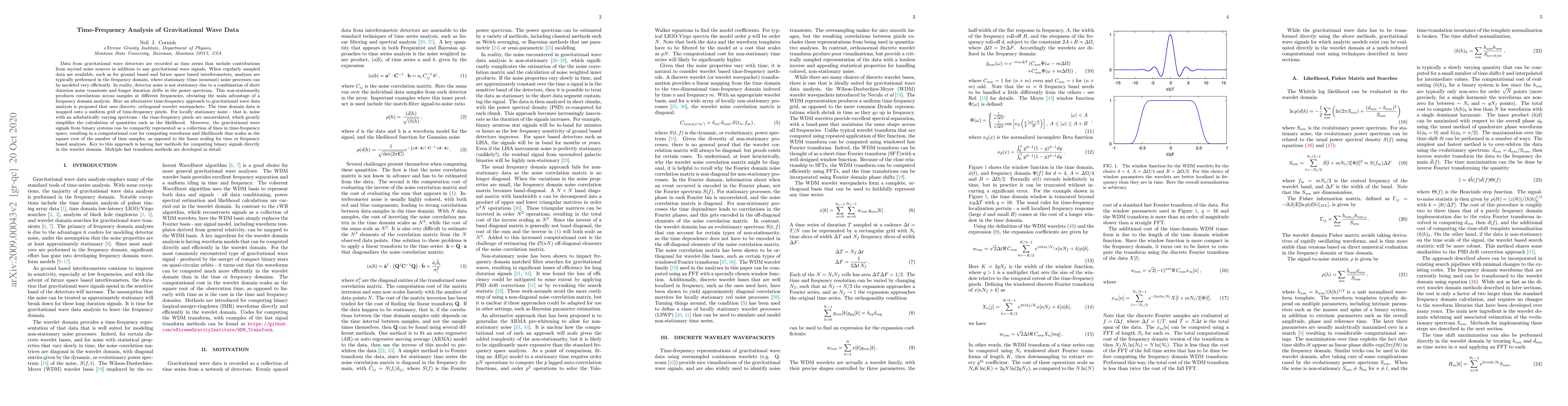 Data from gravitational wave detectors are recorded as time series that include contributions from myriad noise sources in addition to any gravitational wave signals. When regularly sampled data are available, such as for ground based and future space based interferometers, analyses are typically performed in the frequency domain, where stationary (time invariant) noise processes can be modeled very efficiently. In reality, detector noise is not stationary due to a combination of short duration noise transients and longer duration drifts in the power spectrum. This non-stationarity produces correlations across samples at different frequencies, obviating the main advantage of a frequency domain analysis. Here an alternative time-frequency approach to gravitational wave data analysis is proposed that uses discrete, orthogonal wavelet wavepackets. The time domain data is mapped onto a uniform grid of time-frequency pixels. For locally stationary noise - that is, noise with an adiabatically varying spectrum - the time-frequency pixels are uncorrelated, which greatly simplifies the calculation of quantities such as the likelihood. Moreover, the gravitational wave signals from binary systems can be compactly represented as a collection of lines in time-frequency space, resulting in a computational cost for computing waveforms and likelihoods that scales as the square root of the number of time samples, as opposed to the linear scaling for time or frequency based analyses. Key to this approach is having fast methods for computing binary signals directly in the wavelet domain. Multiple fast transform methods are developed in detail.