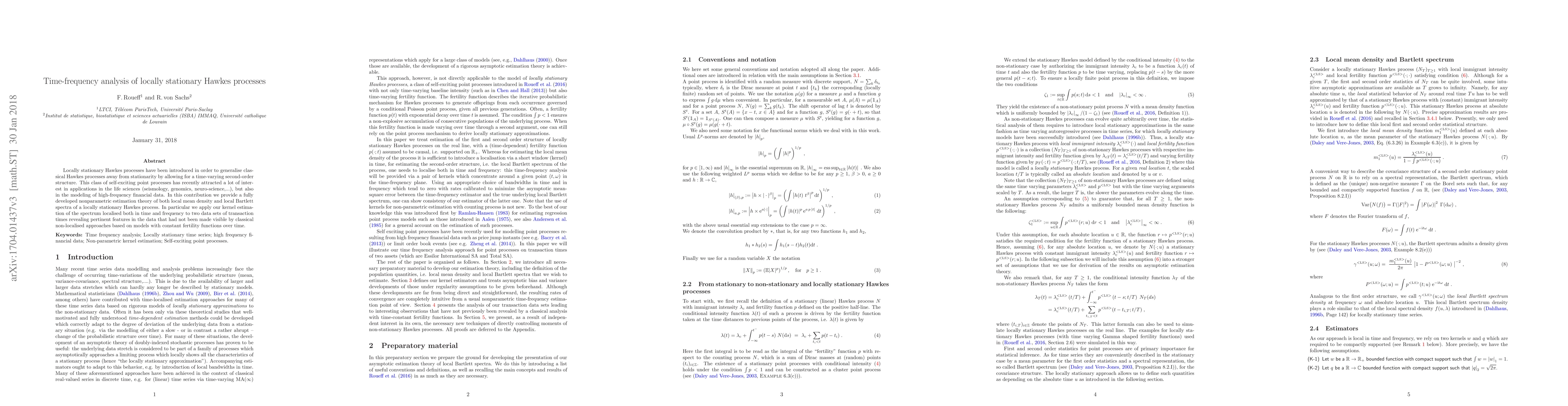 This paper develops nonparametric estimation techniques for locally stationary Hawkes processes, focusing on time-frequency analysis to estimate local mean density and local Bartlett spectra. The proposed methods reveal features in transaction time data that traditional constant fertility models miss.