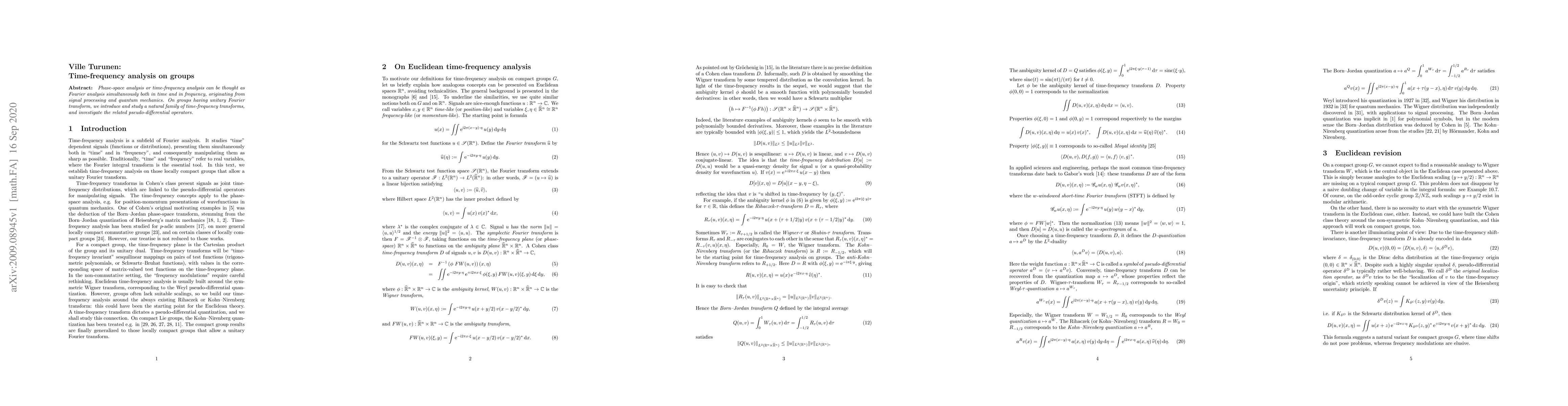 Phase-space analysis or time-frequency analysis can be thought as Fourier analysis simultaneously both in time and in frequency, originating from signal processing and quantum mechanics. On groups having unitary Fourier transform, we introduce and study a natural family of time-frequency transforms, and investigate the related pseudo-differential operators.